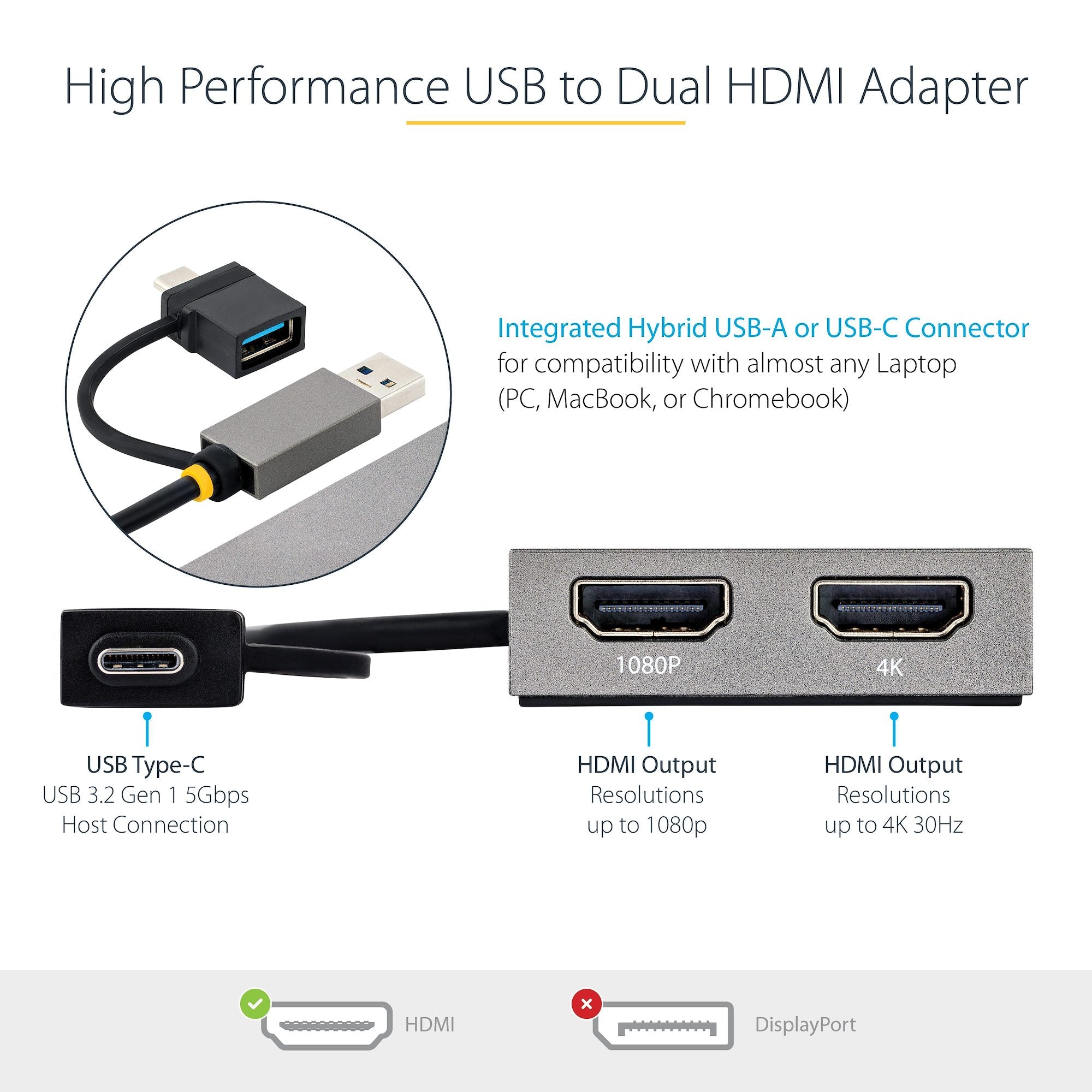 Adaptador De Usb 3.0 A Hdmi Doble, Usb A/C A 2 Pantallas Hdmi , Dongle Usb-A A C, Cable De 11cm, Win/Mac Modelo 107b-Usb-Hdmi