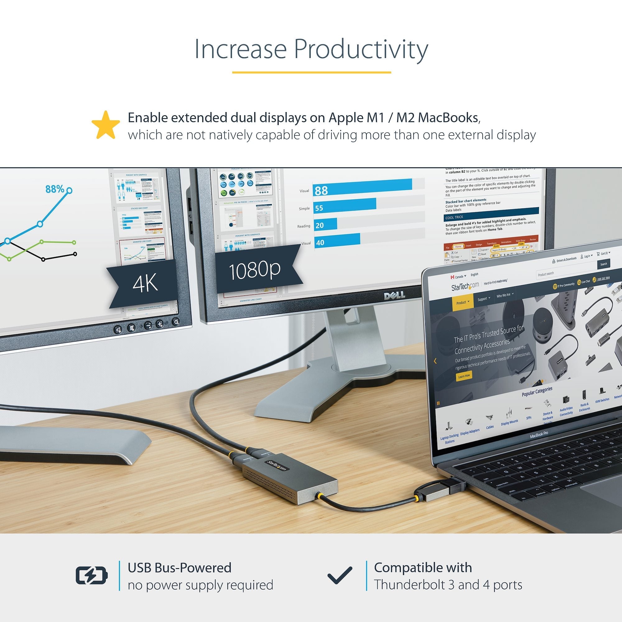 Requerimientos del sistema y cables: se necesita instalar los controladores manualmente en macos longitud del cable: 110 mm led: 1 encendido (azul) entrada a/v: usb-c entrada a/v: usb 3.2 gen 1(5gbps) salida a/v: hdmi - 1.4 id del conjunto de chips: silicon motion - sm768 especificaciones de audio: hdmi - 2 channel audio usb 3.0 pass through: no resolucion digital maxima: 3840 x 2160 a 30hz resoluciones admitidas: output 1: 3840×2160; 2560×1440; 1920×1080; 1600×900; 1280×720 output 2: 1920 x 1080, 1600 x 900, 1280x720 other lower resolutions may be supported pantalla plana soportada: si memoria: 8gb ddr3 conector a: 1 usb 3.2 type-a (9 pin, gen 1, 5gbps) conector a: 1 usb 3.2 type-c (24 pines, gen 1, 5gbps) conector b: 2 hdmi (19 pines) adaptador de corriente incluido: alimentacion por bus color: gris tipo de gabinete: plastico longitud del producto: 275.000 mm ancho del producto: 50.000 mm altura del producto: 15.000 mm peso del producto: 86.000 g