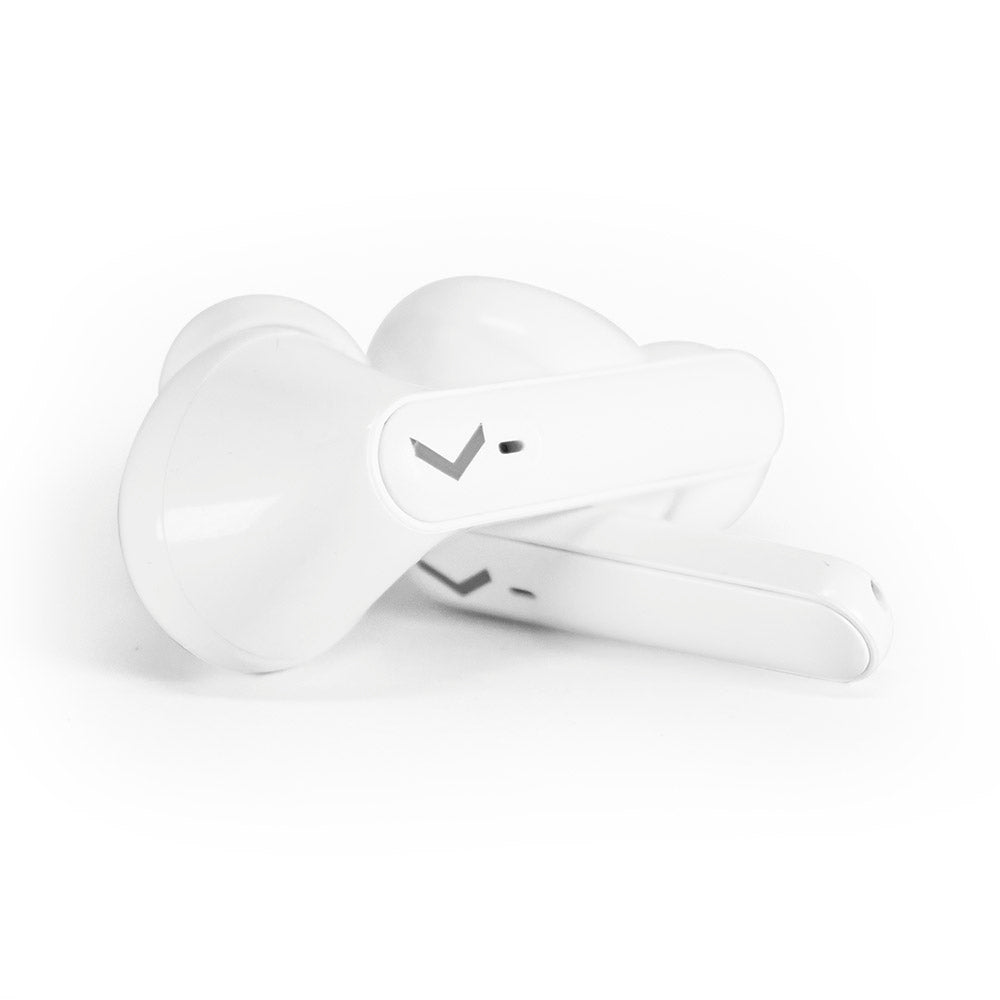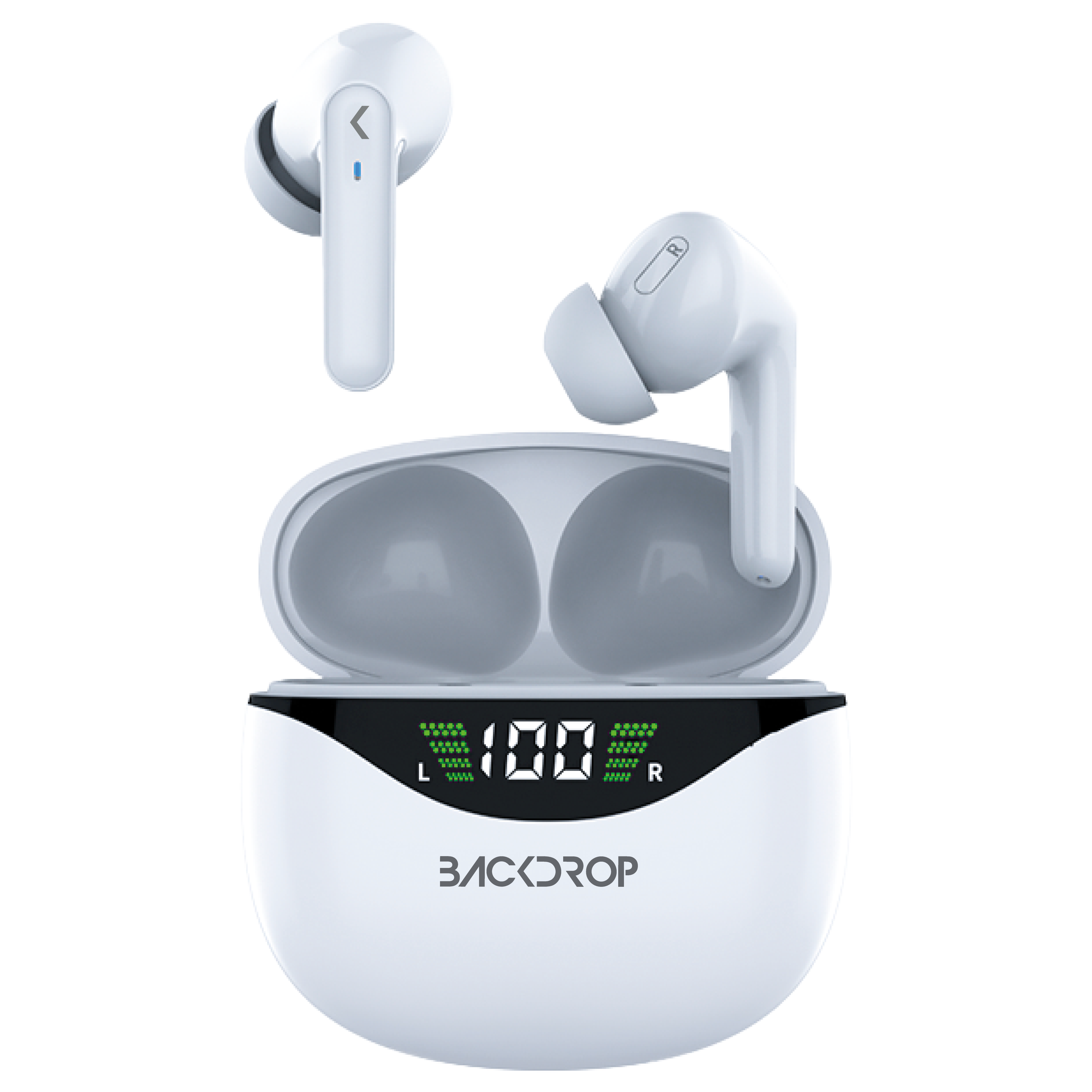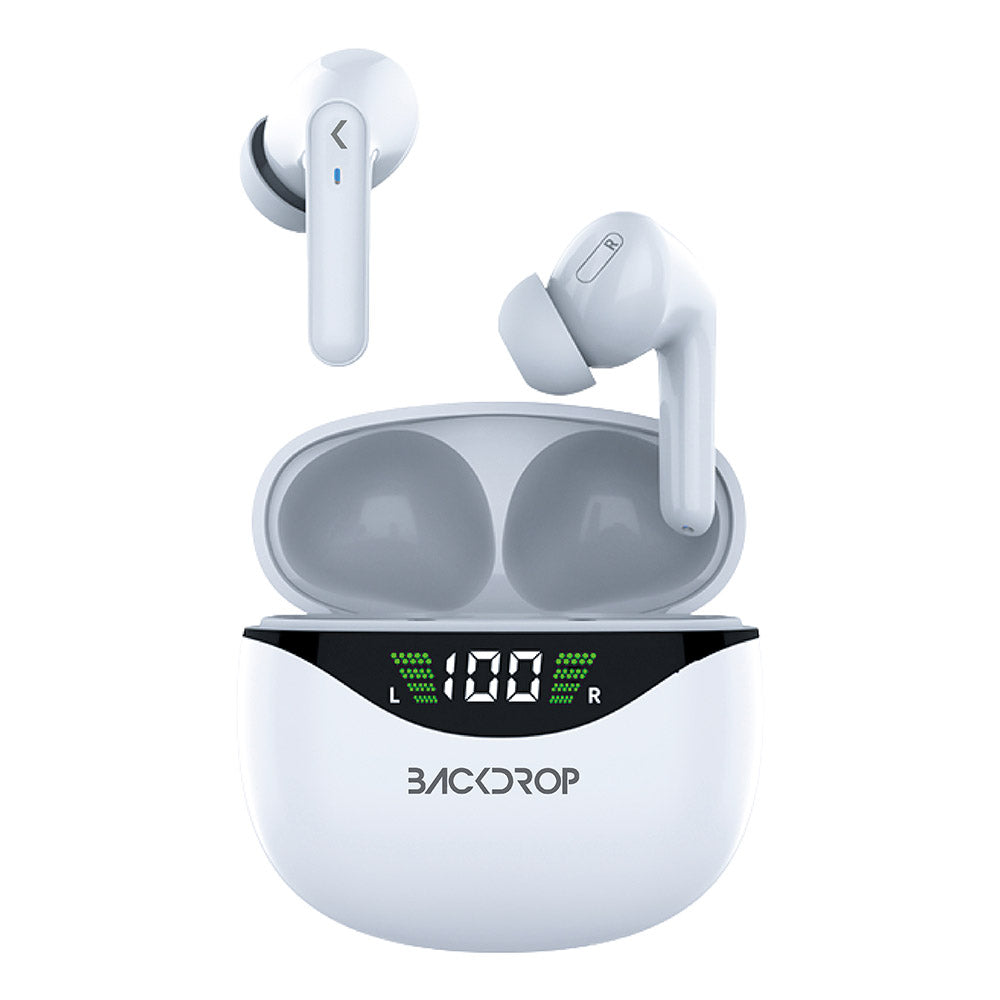 Audífonos Inalámbricos Backdrop. Bluetooth 5.0, Micrófono, Touch, Caja de carga con pantalla. Modelo TWS-3B. Color blanco