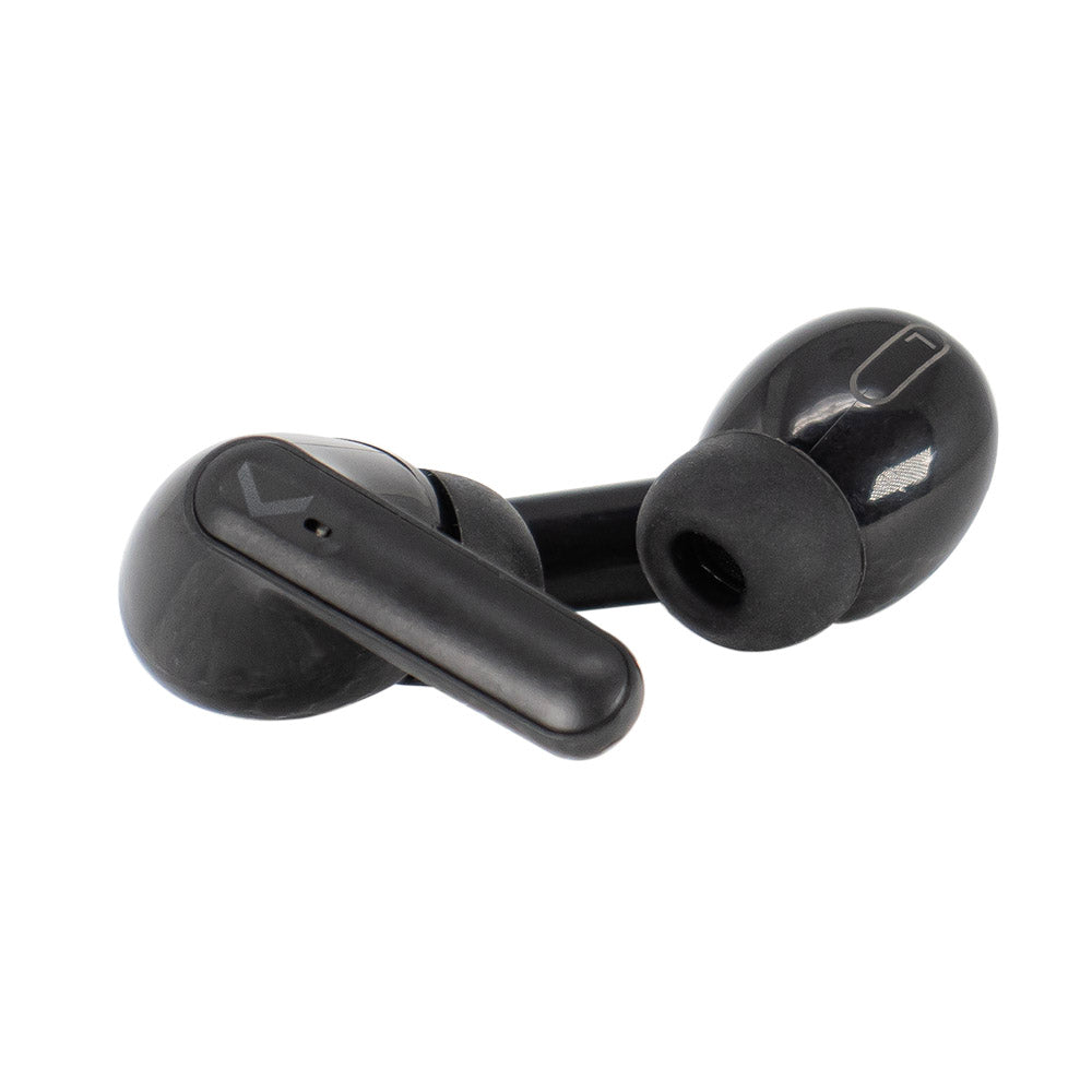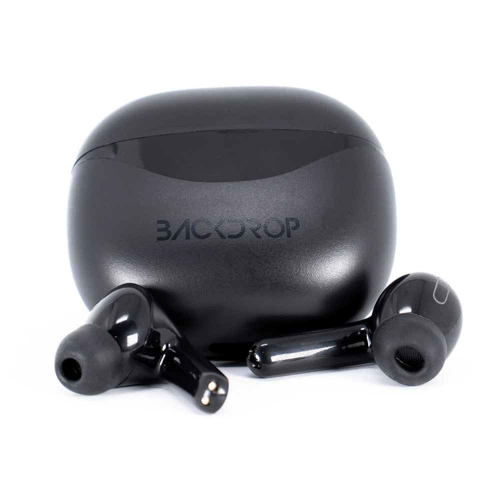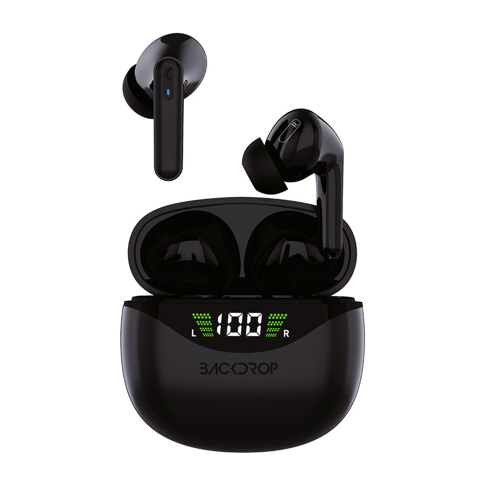 Audífonos Inalámbricos Backdrop. Bluetooth 5.0, Micrófono, Touch, Caja de carga con pantalla. Modelo TWS-3N. Color negro