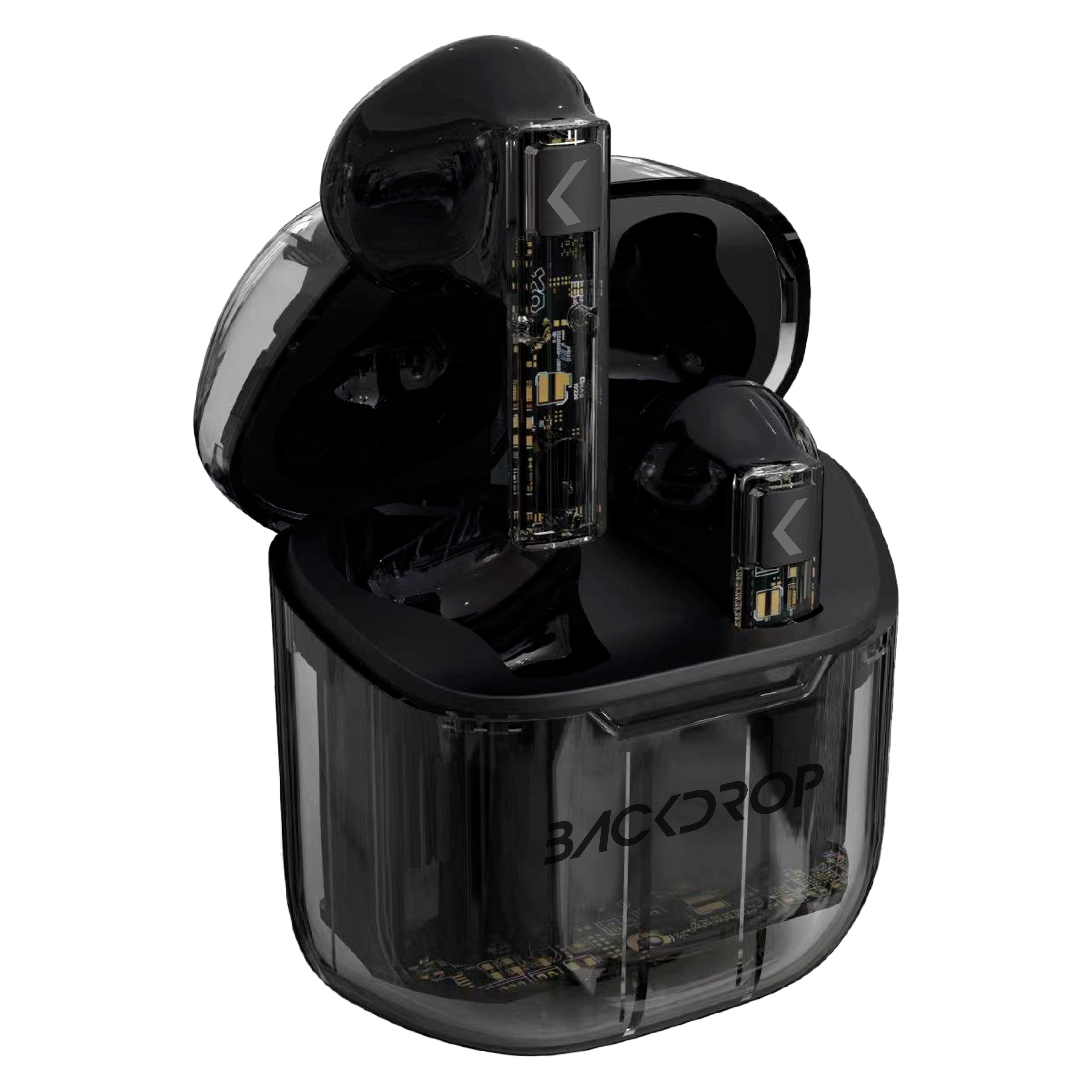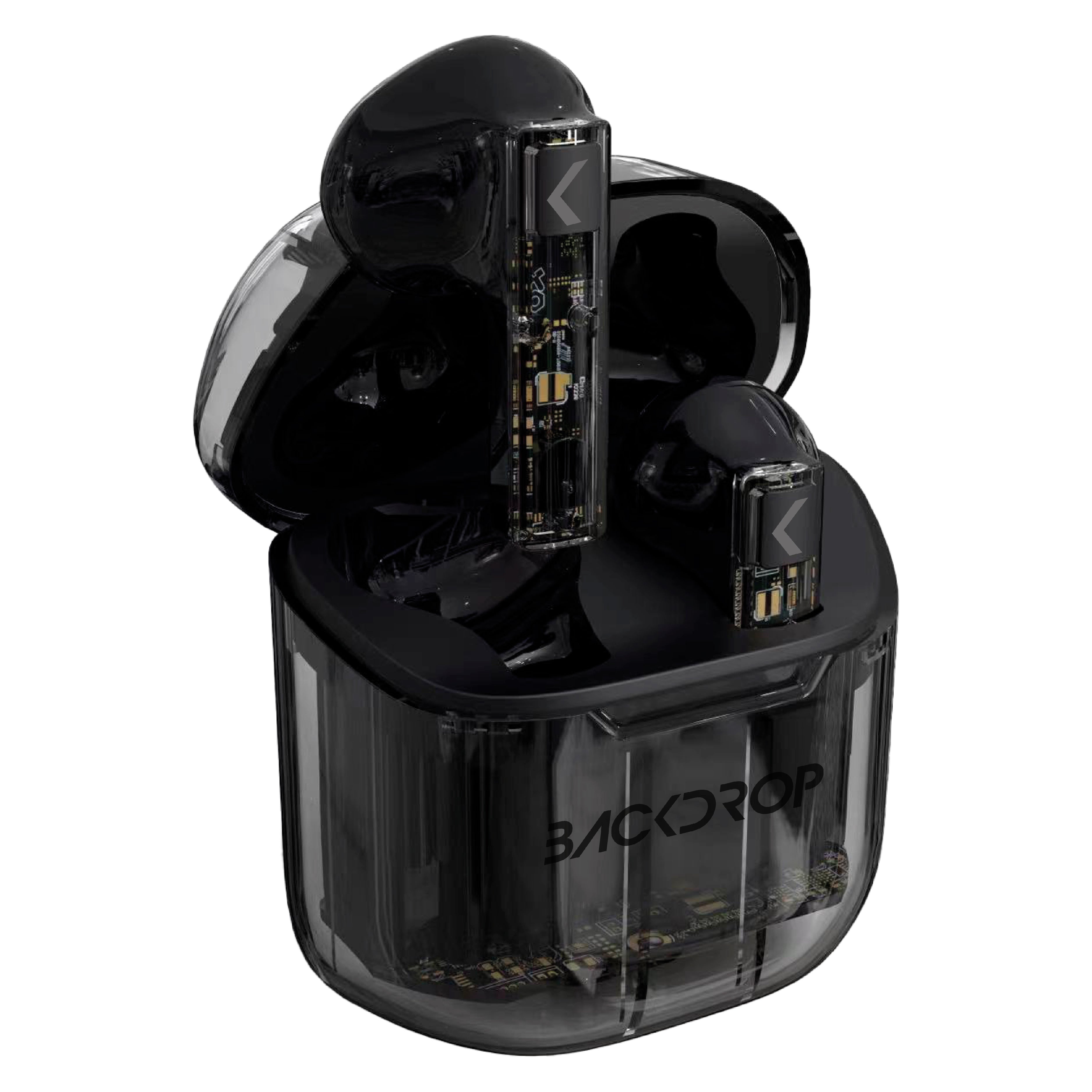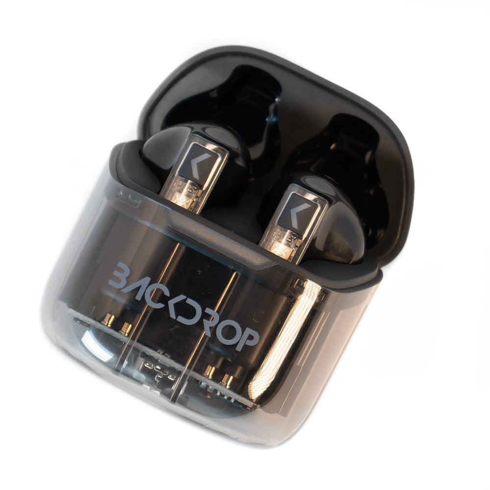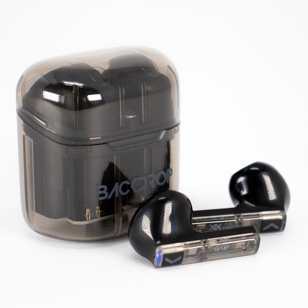 Audífonos Inalámbricos Backdrop. Bluetooth 5.3, Micrófono, Transparentes, Touch, Modelo TWS-4. Color negro