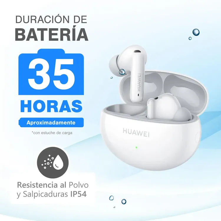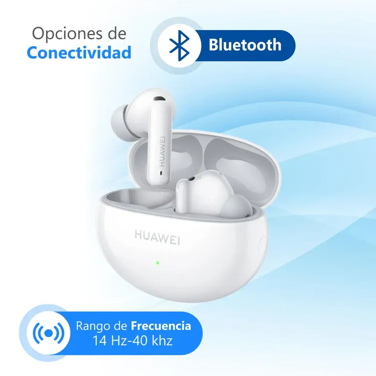 Huawei FreeBuds 6i. Tipo de producto: Auriculares. Tecnología de conectividad: True Wireless Stereo (TWS), Bluetooth. Uso recomendado: Llamadas/Música. Frecuencia de auricular: 14 - 40000 Hz. Peso: 5.4 g. Color del producto: Blanco