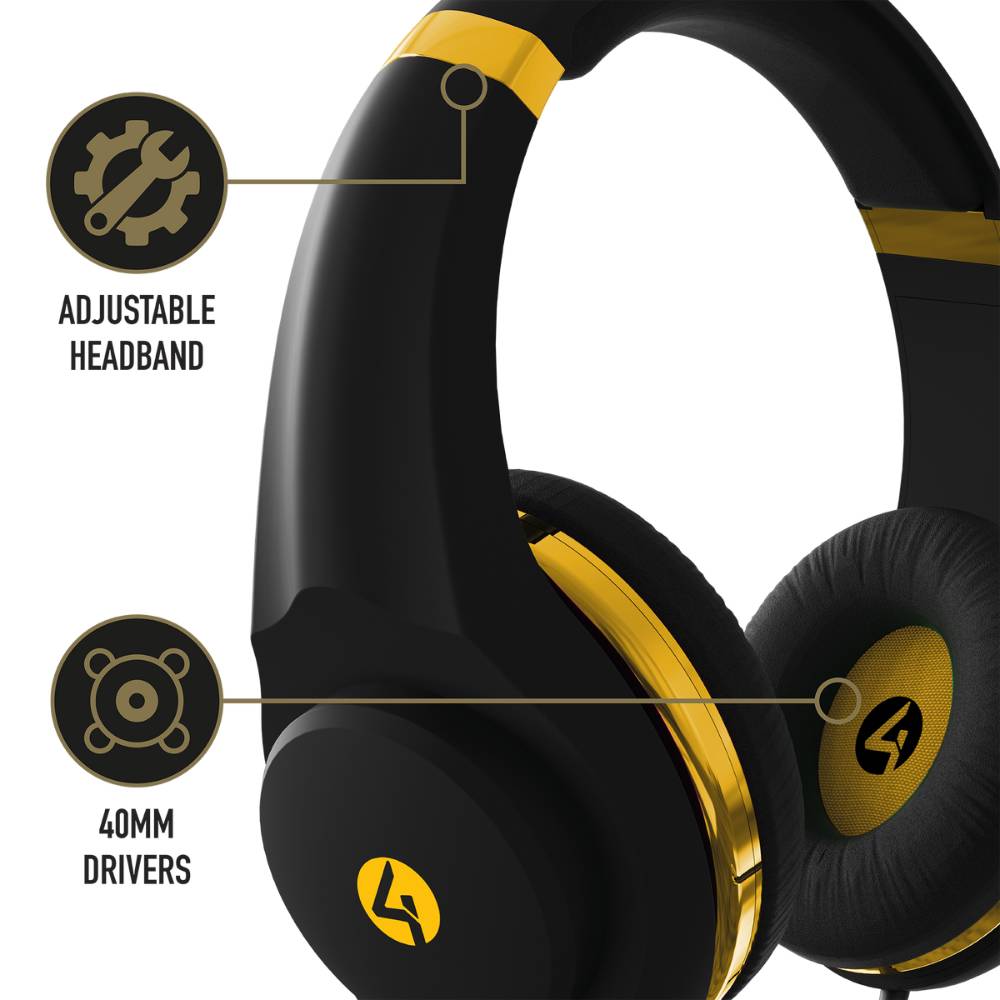 Auriculares para juegos 4Gamers XP-GOLDBLK-M-4G (Color Negro-Dorado), Almohadillas de cuero sintético con espuma suave y una diadema flexible, Micrófono flexible, cable de 1.20 m, Controles en línea, Multiplataforma, conectores de 3.5 mm, permiten su uso tanto en Xbox,PS4/PS5, Altavoces de 40 mm, Muteo de micrófono, La unidad de disco mide 4 cm y ofrece un sonido claro y nítido.