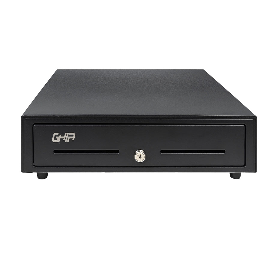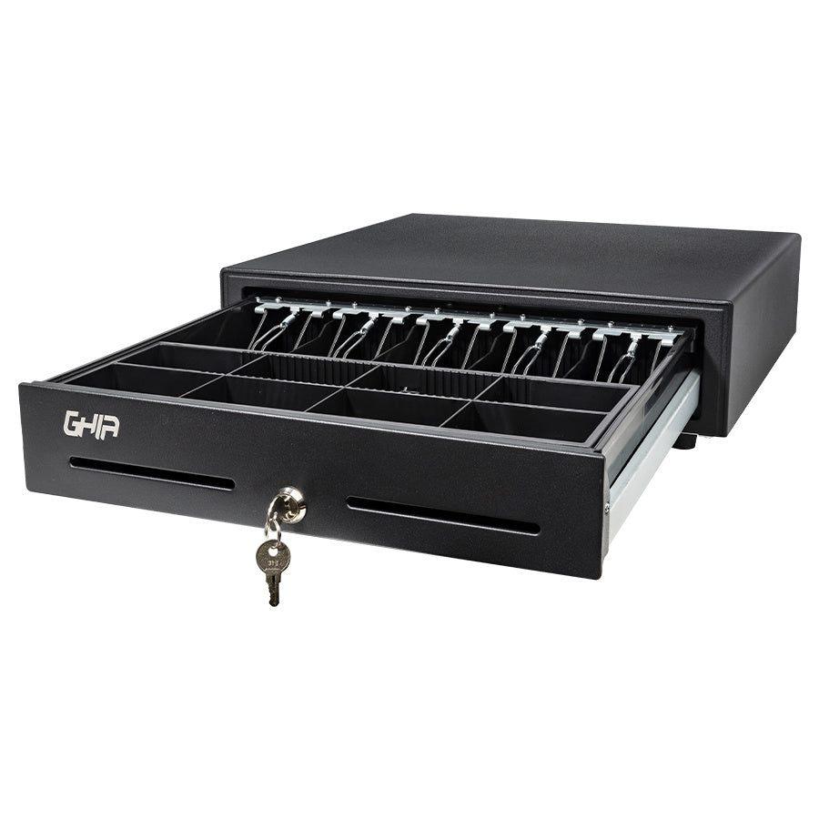 Cajón De Dinero Ghia Negro Uso Rudo, Charola Removible, Panel Frontal Metálico, Compartimientos 5 Billetes Y 8 Monedas