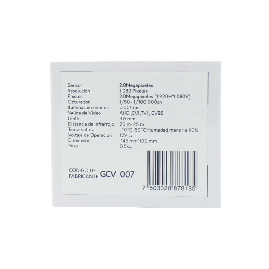 Modelo GCV-007 Sensor Color 1/2.7" 2.0MP SENSOR Resolución 1080P Pixeles 2.0M (1920H*1080V) Obturador 1/50- 1/100,000sn Iluminación mínima 0.001LUX Salida de Video AHD ,CVI ,TVI , CVBS Lente 3.6mm Distancia de Infrarrojo 20m-25m Temperatura -10°C~50°C Humedad menor a 90% Voltaje de Operacion 12V Material Policarbonato