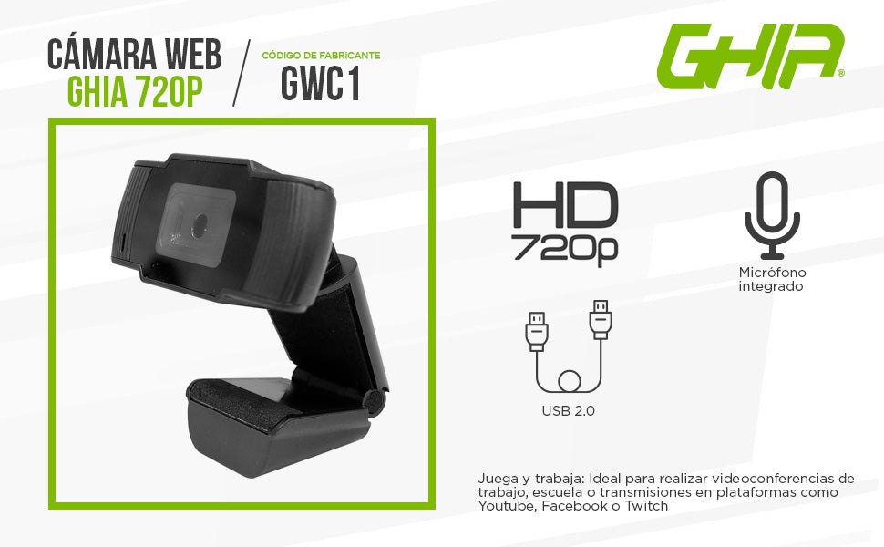 Camara Web Ghia 720p Hd, Microfono Integrado 3.5mm, Enfoque Fijo, Color Negro
