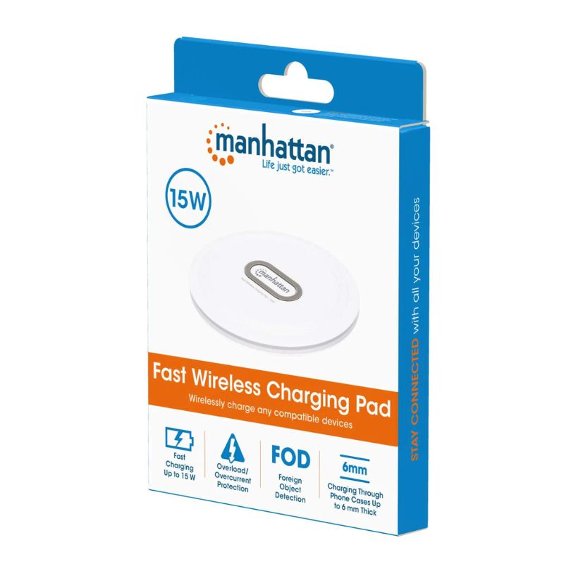 Este cargador inalámbrico de Manhattan permite una carga rápida compatible con Qi con todos los teléfonos que la admiten. Con una potencia de hasta 15 W/10 W/7,5 W para teléfonos de Google™, Samsung®, LG, Apple® y más, estarás listo para entrar no hay tiempo. También puedes cargar otros dispositivos como AirPods®, fundas y relojes inteligentes.