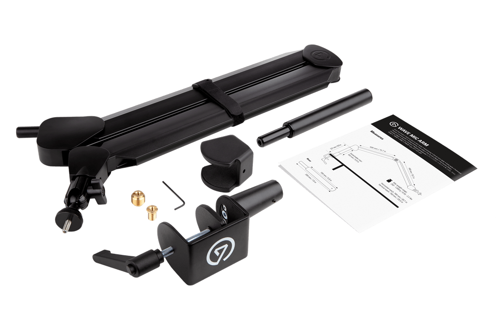 Wave Mic Arm, Extensión elevadora, Contrapeso, Adaptadores de rosca de 1/4 a 3/8 pulgadas, y de 1/4 a 5/8 pulgadas, Llave de allen, Guía de inicio rápido