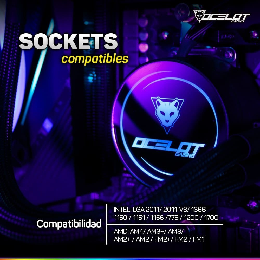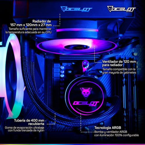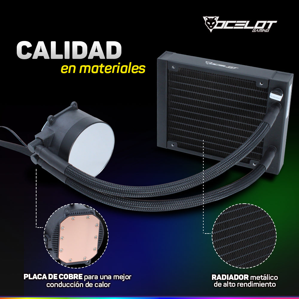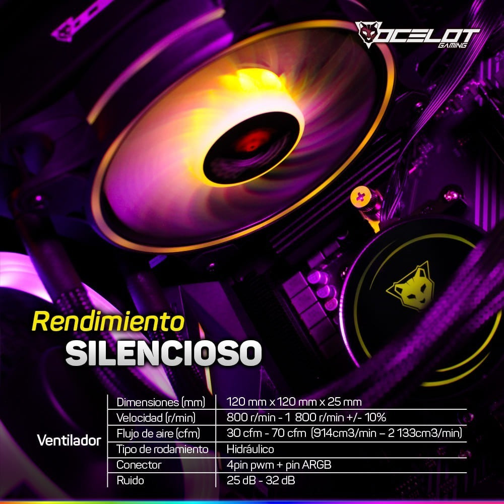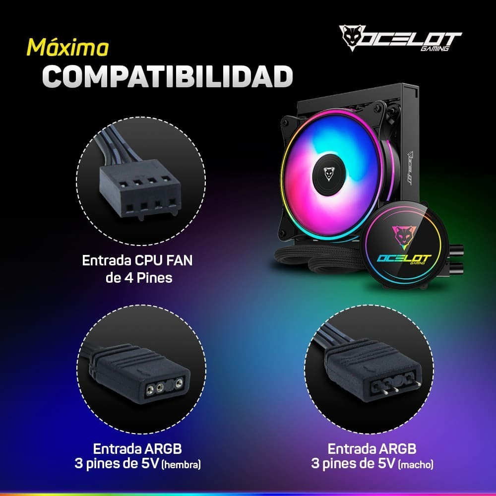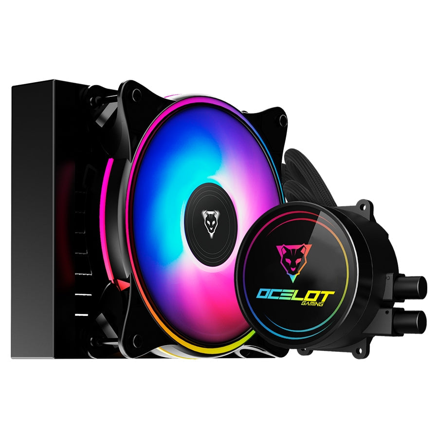 Enfriamiento Líquido Gamer Ocelot Disipador Ventilador de 120mm Iluminación ARGB Color Negro Modelo OEL120