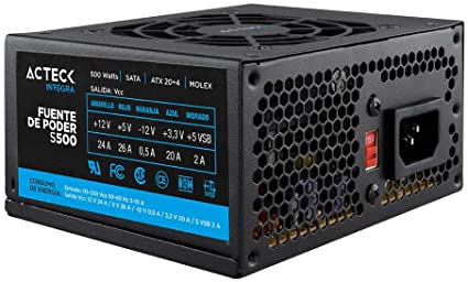 Fuente de poder ATX 500w 80 plus, bajo nivel de ruido, switch de encendido incluido con ventilador de 120 mm.