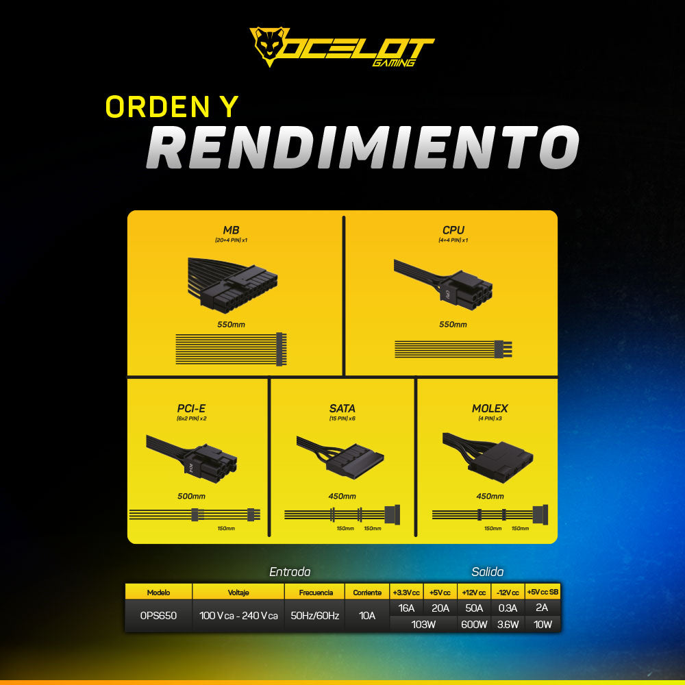 Con una capacidad de 650W y certificación 80+ Bronce, la OPS650 de Ocelot Gaming proporciona la potencia necesaria para alimentar tus componentes de juego más exigentes. ¡Desata el máximo rendimiento sin comprometer la estabilidad!