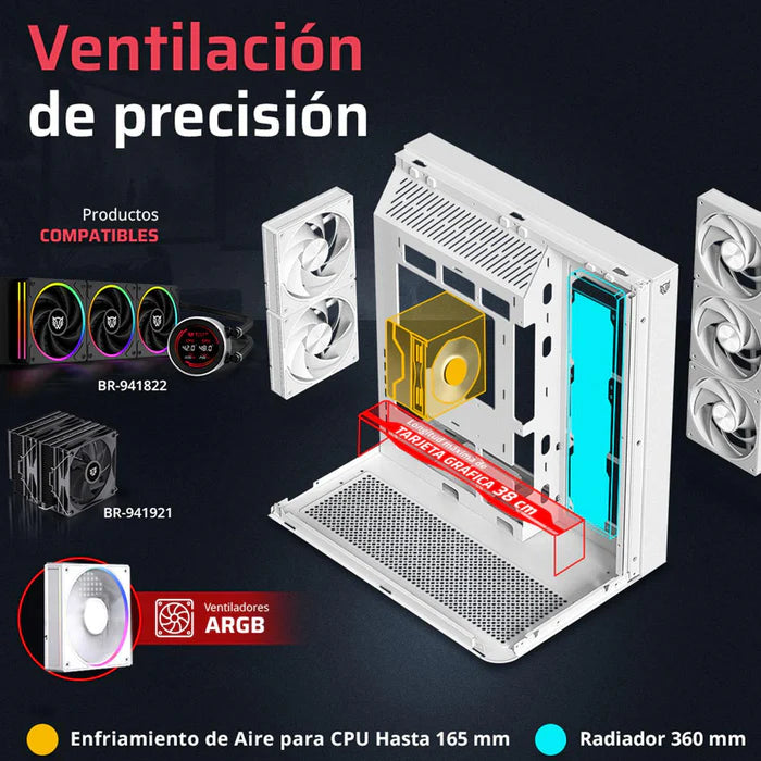 Con múltiples bahías para almacenamiento, excelente flujo de aire y soporte para sistemas de refrigeración líquida, este gabinete es ideal para gamers, creadores de contenido y profesionales que buscan funcionalidad y presentación premium en su equipo.