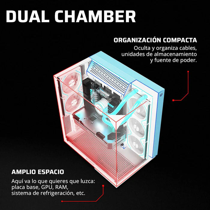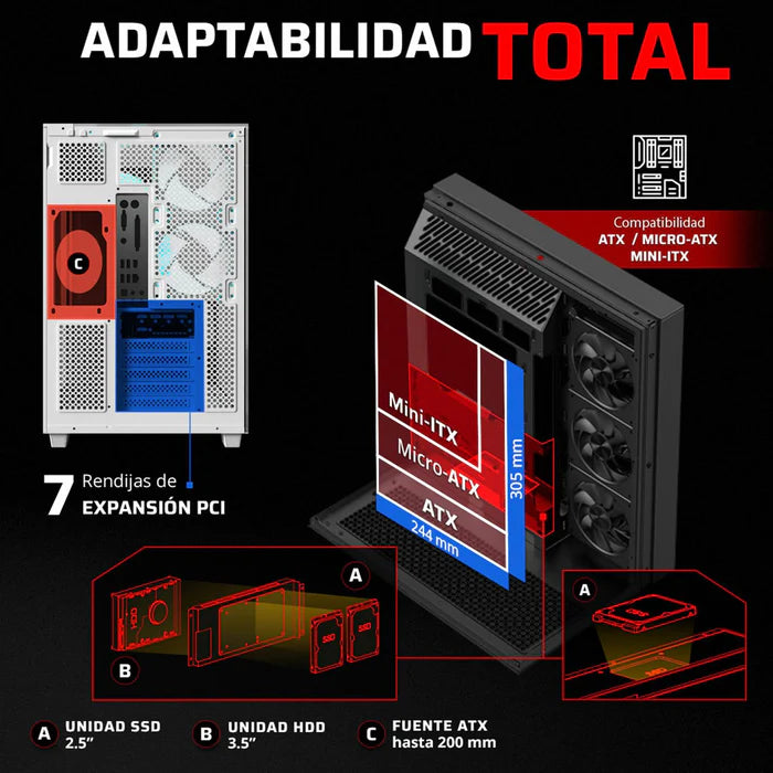 Compatible con motherboards ATX, Micro-ATX y Mini-ITX, este gabinete se adapta a cualquier configuración y te permite llevar tu PC al siguiente nivel. Con espacio para tarjetas gráficas de hasta 380 mm de longitud, el Tank Majestic 7600 está listo para lo último en gaming. Excelente flujo de aire para mantener las temperaturas bajo control en sesiones intensas, con capacidad para 8 ventiladores de 120 mm (incluye 5 preinstalados).