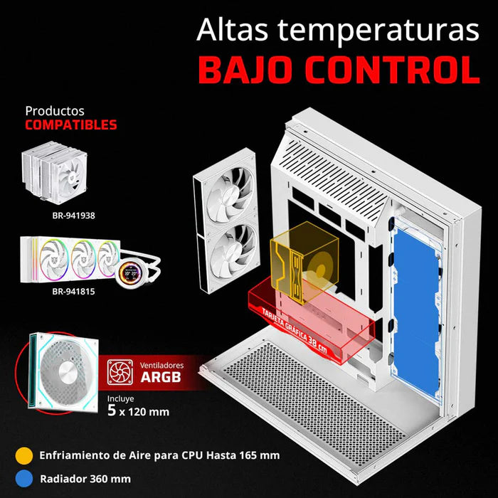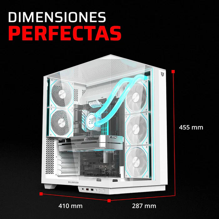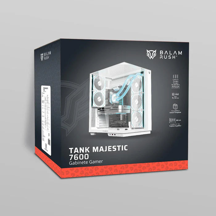 Gabinete Gamer BALAM RUSH TANK MAJESTIC 7600 ATX Media Torre 5 Fan Panel Cristal Templado USB-C ARGB - Blanco