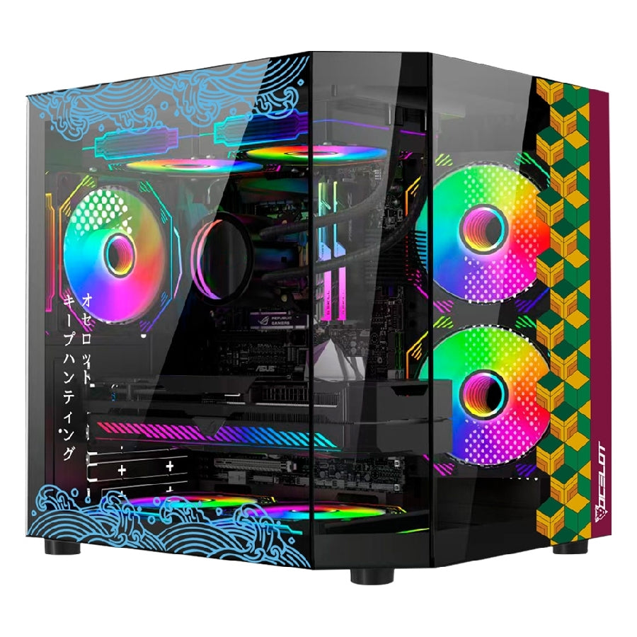 El Gabinete Gamer Ocelot Gaming BLACK MIZU destaca por su diseño estilo anime inspirado en patrones de agua y formas geométricas.