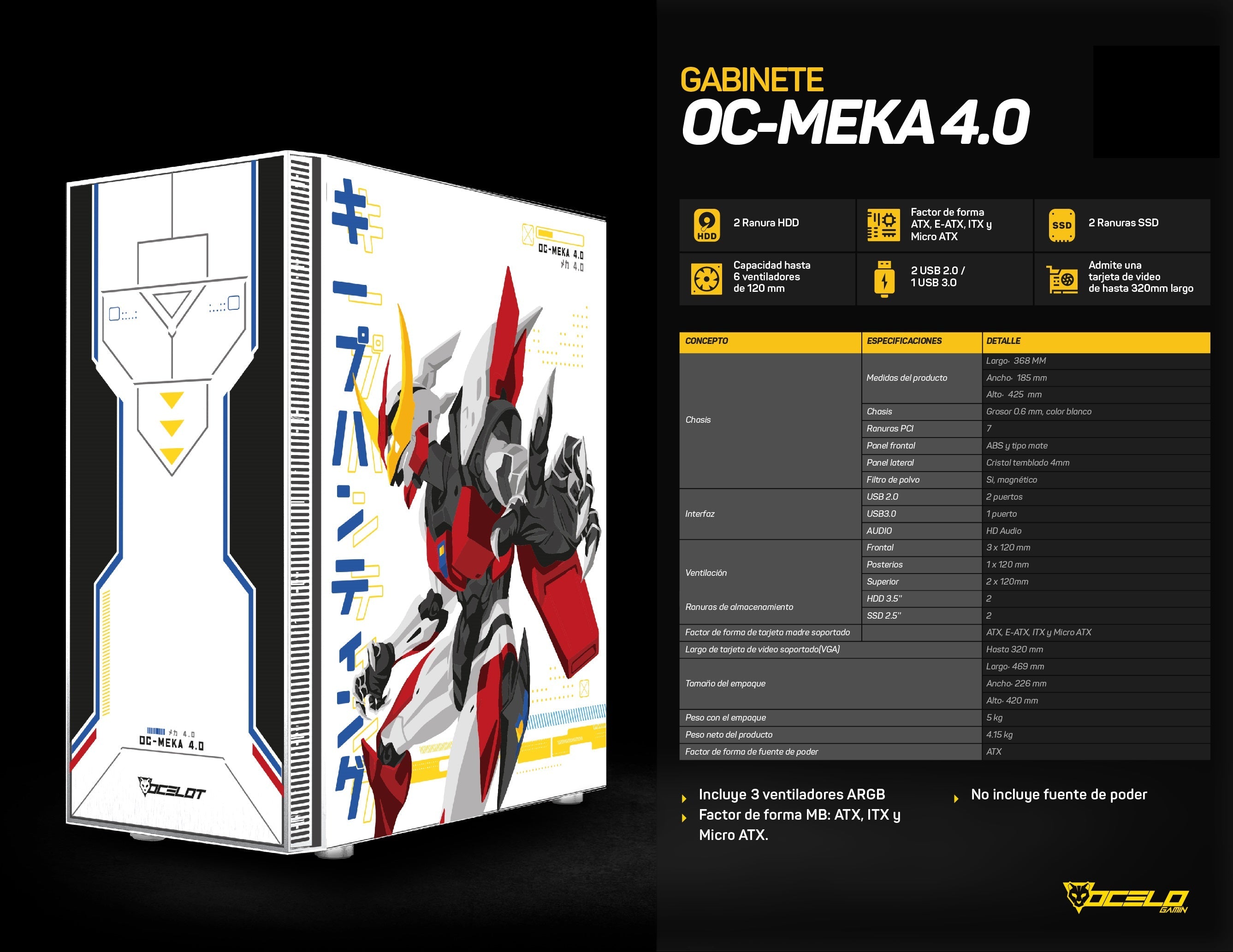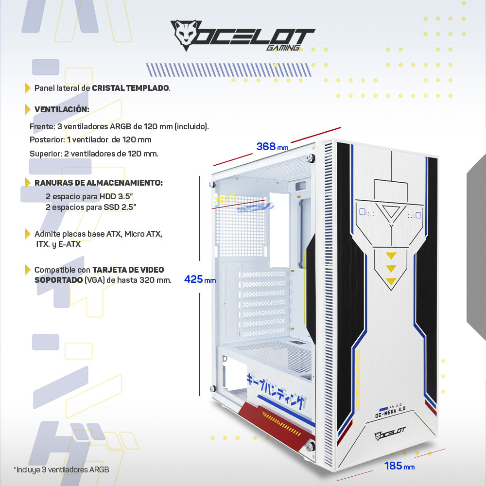 Gabinete para PC Ocelot Gaming OC-MEKA 4.0. Mid Tower, E-ATX, ATX, Micro ATX, Mini ITX, panel lateral de cristal templado. 3 ventiladores ARGB preinstalados