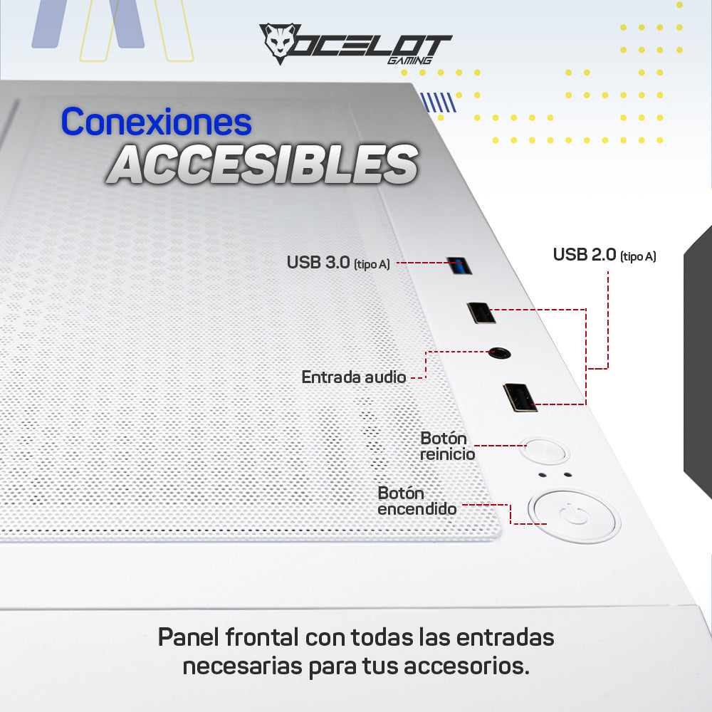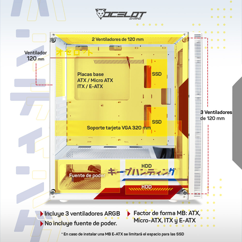 El Gabinete Ocelot Gaming en color blanco con diseño anime es una excelente opción para los gamers que buscan un equipo robusto y estilizado. Este modelo de media torre soporta una configuración de hasta 8 ventiladores de 120 mm, permitiendo una óptima ventilación para largas sesiones de juego.