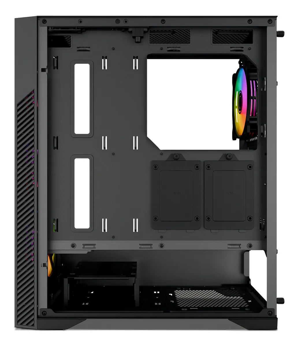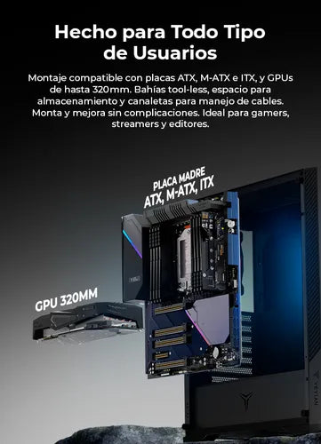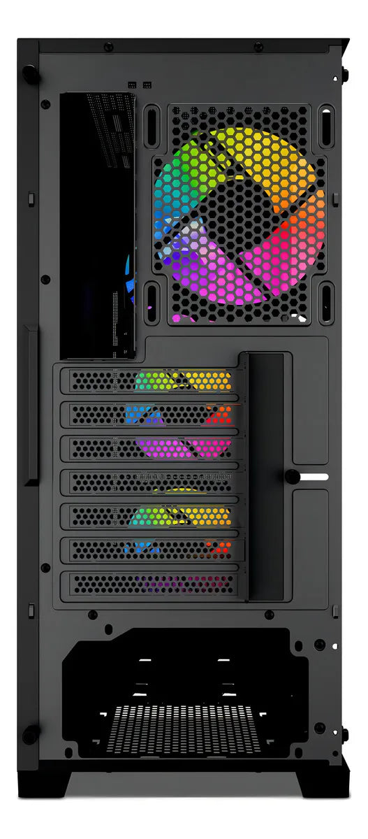 Con sus múltiples puertos, incluyendo un USB 3.0 Tipo C de alta velocidad, y una gestión de cables inteligente, este gabinete facilita la conectividad y el mantenimiento. Sus bahías de almacenamiento flexibles y sus siete ranuras de expansión te dan el espacio que necesitas para crecer. Este gabinete es la base perfecta para construir una máquina potente y visualmente deslumbrante.