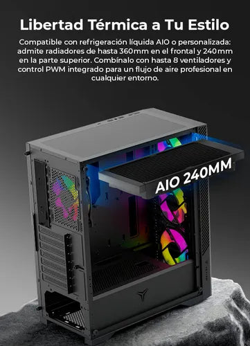 La verdadera fortaleza de este gabinete reside en su sistema de enfriamiento avanzado. Viene preinstalado con cuatro ventiladores ARGB que no solo mantienen tus componentes a la temperatura ideal, sino que también crean un espectáculo de luces impresionante, fácilmente personalizable con el botón de Switch LED. Además, tienes la opción de agregar hasta cuatro ventiladores más, o instalar un sistema de enfriamiento líquido de hasta 360 mm, asegurando un rendimiento térmico óptimo incluso en las sesiones de juego más intensas.
