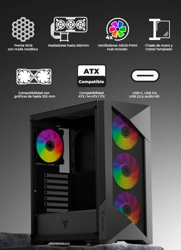 Descubre el gabinete de media torre que redefine el rendimiento y el estilo para tu PC. Diseñado para entusiastas y creadores de contenido, este gabinete combina una estética elegante con una funcionalidad superior. Su espacioso interior es compatible con tarjetas madre ATX, Micro-ATX e ITX, ofreciendo una versatilidad sin igual para tu próxima construcción o actualización. El panel lateral de cristal templado no solo le da un toque premium, sino que también te permite lucir tu hardware y la vibrante iluminación ARGB.