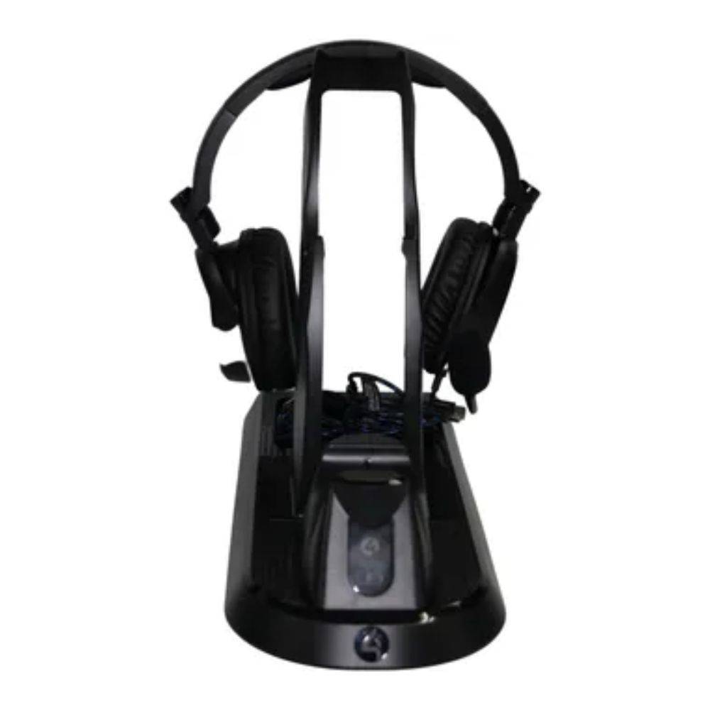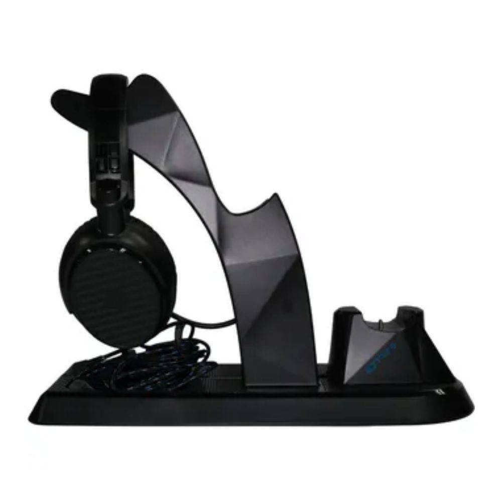 Gaming Station 4Gamers para PS5 con auriculares UGS-V1-BLK-4G, soporte para auriculares (color Negro), Base de carga para controles PS5 DualSense, cable play & charge para carga de centro mientras esta en uso, alimentación por USB-C, cable de carga trenzado desmontable de 2 mts, indicador de carga LED.