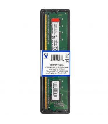 El KVR26N19S6 / 4 de ValueRAM es un 512M x 64 bits (4 GB) DDR4-2666 CL19 SDRAM (DRAM síncrona), 1Rx16, módulo de memoria, basado en cuatro FBGA de 512 M x 16 bits componentes. El SPD está programado según el estándar JEDEC latencia DDR4-2666 sincronización de 19-19-19 a 1,2 V. Cada 288 pines DIMM utiliza dedos de contacto dorados