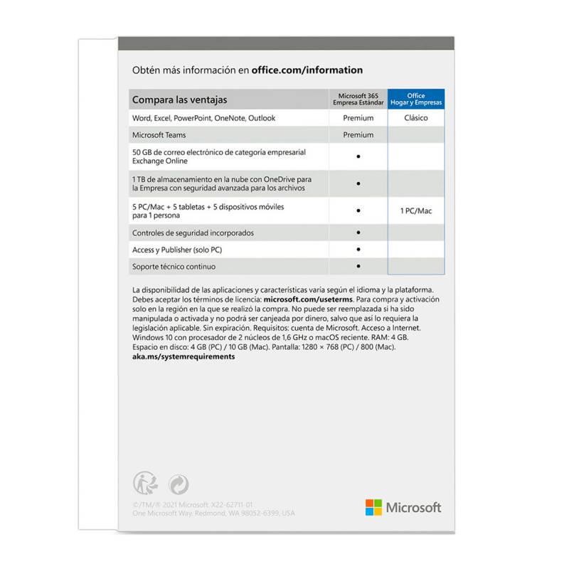Las herramientas esenciales para hacer todo el trabajo. Office Hogar y Empresas 2021 es para familias y pequeñas empresas que necesitan las aplicaciones clásicas de Office y correo electrónico. Incluye Word, Excel, PowerPoint y Outlook para Windows 11 y Windows 10. Compra de pago único que se instala en 1 equipo PC o Mac para uso en el hogar o el trabajo.