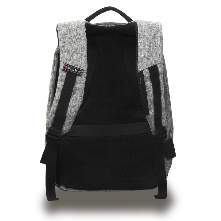 BACK PACK ANTIRROBO TECHZONE DE 15.6" COLOR GRIS, HECHO EN POLIESTER Y PANEL FRONTAL REFORZADO EN POLIURETANO, COMPARTIMIENTOS PARA LAPTOP Y TABLET INDEPENDIENTES CON CINTURON DE SEGURIDAD AL INTERIOR PARA MAYOR SUJECION DE TUS EQUIPOS, COMPARTIMIENTO PARA POWER BANK CON CONECTOR USB DE CARGA AL EXTERIOR, TIRANTES AJUSTABLES Y ACOLCHADOS, ADEMAS CUENTA CON SISTEMA DE VENTILACION EN ESPALDA Y HOMBROS