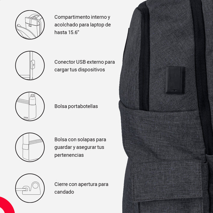 • Compartimento interno y acolchado para laptop de hasta 15.6”.