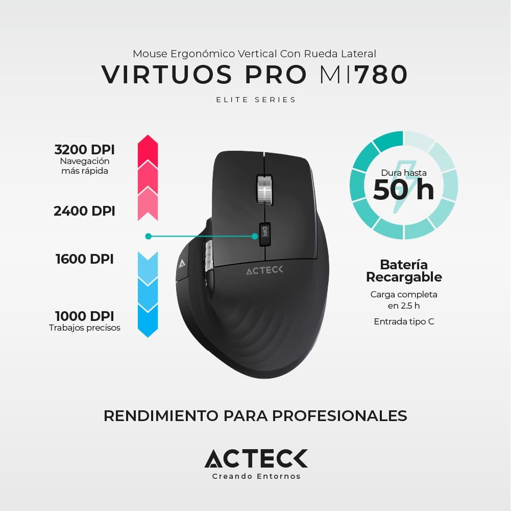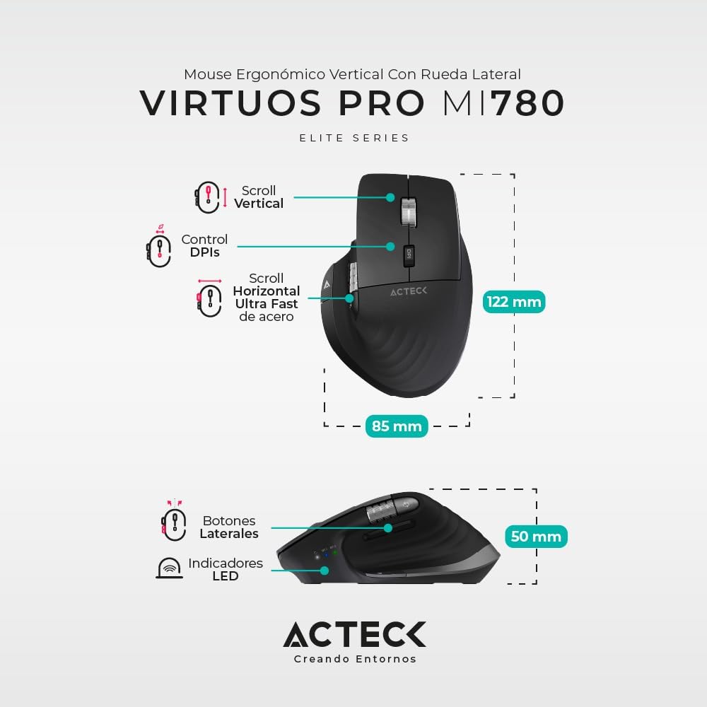 Mouse Inalámbrico Vertical Profesional Virtuos Pro MI780 ACTECK Scroll Horizontal Ultra Fast de acero, Batería recargable 500 mAh, Hasta 90 hrs, Bluetooth 2 Canales y Dongle 2.4 GHz, 10m de alcance, Puerto de carga USB-C, Compatible con Win8 / Win10 / Win11 / MacOS iOS / Android. Resolución, Hasta 3200 DPI, 8 Botones, Negro. AC-936187