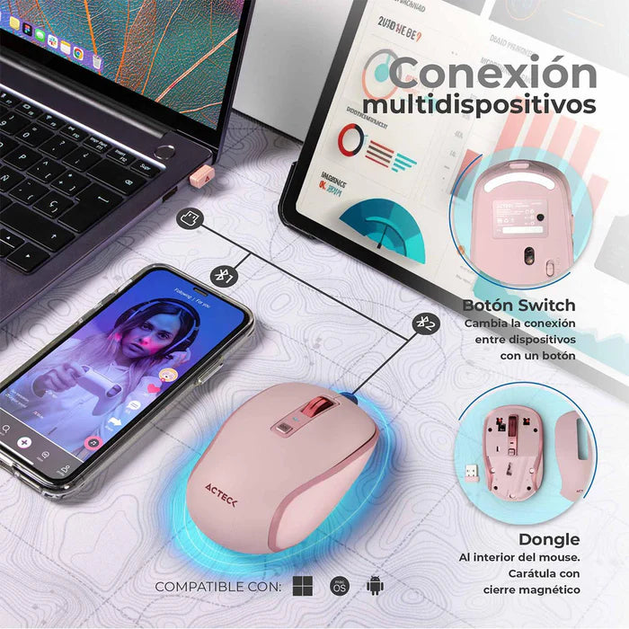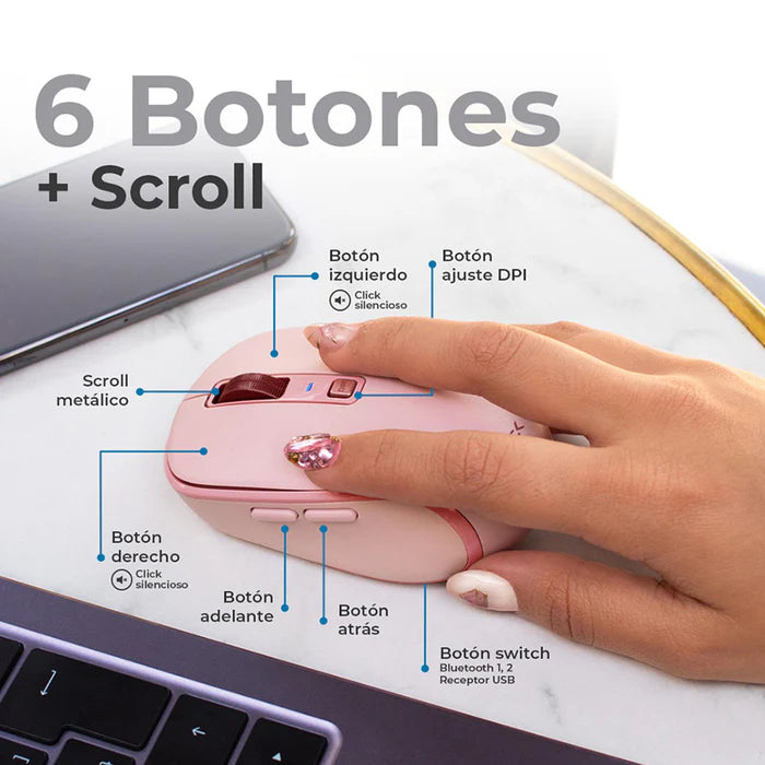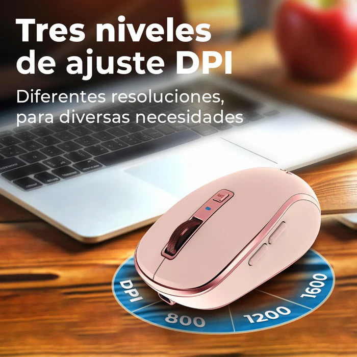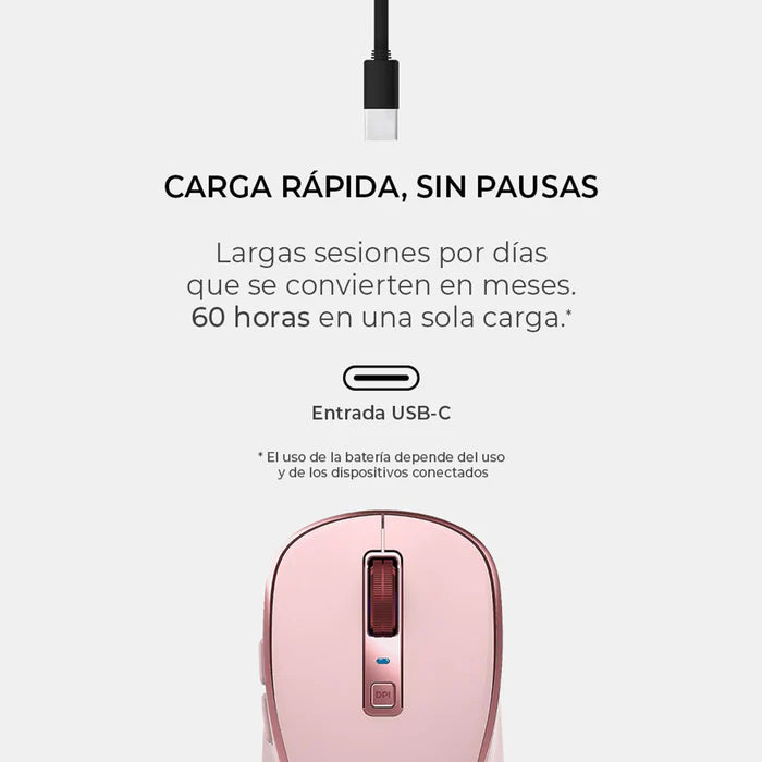Quienes buscan versatilidad y alto rendimiento. Con conectividad 2.4 GHz + Bluetooth, permite cambiar entre varios dispositivos de manera eficiente. Su sensor de 1600 DPI garantiza precisión en cada movimiento, mientras que sus botones ofrecen acceso rápido y personalizable a las funciones que más utilizas. Además, es recargable vía USB-C, eliminando la necesidad de baterías desechables. Su diseño ergonómico y elegante asegura comodidad y estilo, ideal para profesionales en constante movimiento.
