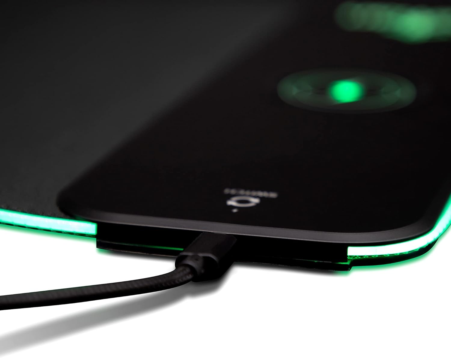 Mouse pad flexible RGB con carga inalámbrica, el cable tiene una longitud de 1.6 m, sus dimensiones son de 1.6m, esta echo de caucho y poliester, con iluminación rojo, verde, azul, morado, naranja, blanco y cyan, la rotación es de 7 colores.