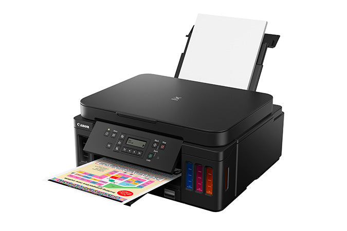 La impresora multifuncional PIXMA G6010 de Canon le permite imprimir, copiar y escanear sin interrupciones. Llene los tanques de tinta incorporados con botellas mejoradas sin complicaciones; aumente el tiempo de funcionamiento con una capacidad de papel común de 350 hojas, e imprima hasta 8,300 páginas de texto en negro o 7,700 páginas en color1, manteniendo la calidad de impresión alta con un bajo costo por página.