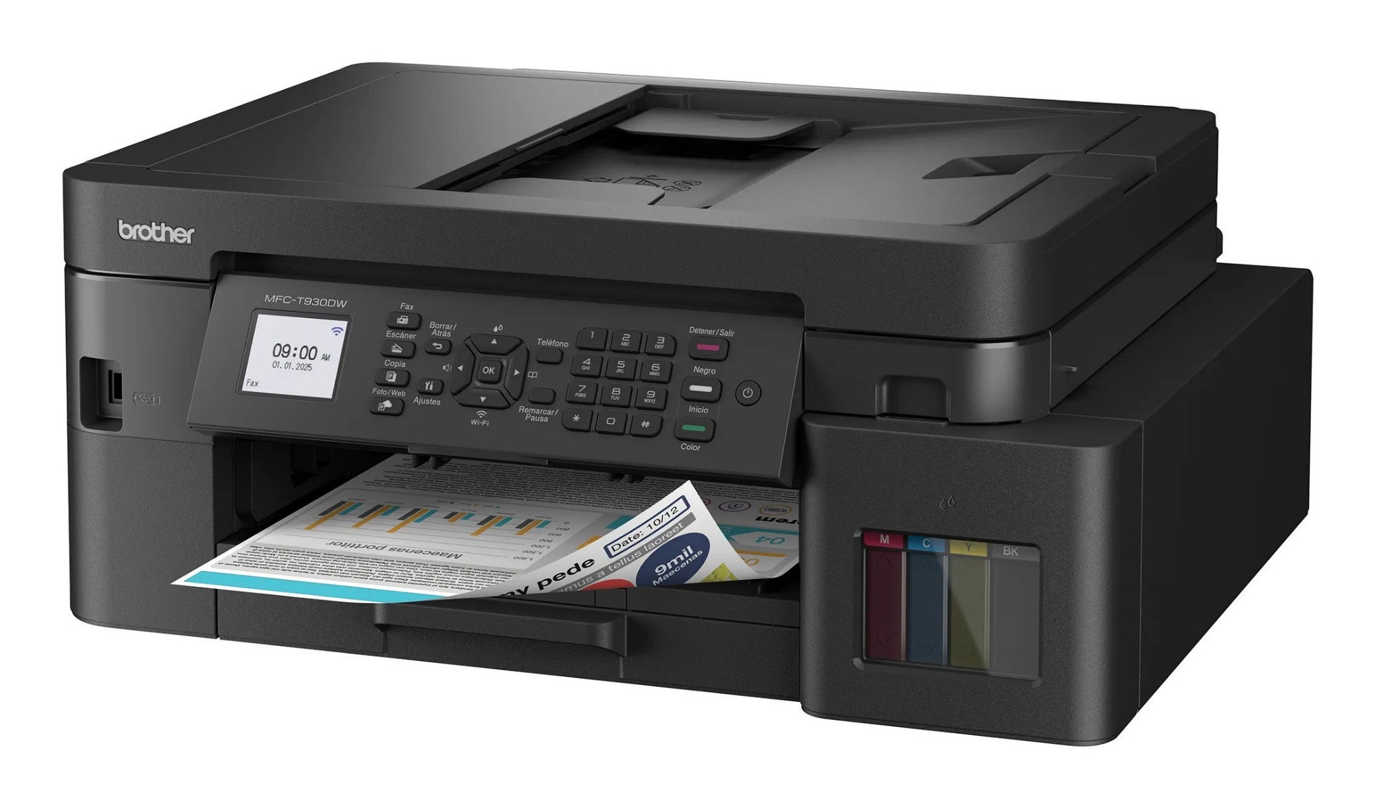 Mejora tu productividad con la impresora multifuncional de inyección de tinta a color MFC-T930DW de la serie InkBenefit Tank de Brother. Realiza sin inconvenientes todas tus tareas de impresión, copiado, escaneado y fax en una práctica y eficiente máquina. Este multifuncional te ofrece impresión de alta calidad con velocidades rápidas de hasta 30 páginas por minuto en negro y 26 páginas por minuto en color cuando imprimes en modo Eco, y velocidades de 17 ipm en negro y 16 ipm en color (ISO/IEC 24734). La atractiva pantalla LCD a color de 1,8 pulgadas y las teclas en el panel de control hacen que usar la impresora sea muy fácil. Cuenta con una bandeja de papel de 150 hojas, una bandeja multipropósito de 80 hojas y un alimentador automático de documentos de hasta 20 páginas‡ para una mayor eficiencia. Conéctate de forma inalámbrica con varias aplicaciones web para que siempre tengas a mano tus documentos en línea. Imprime y escanea a través de tu dispositivo móvil con la aplicación Brother Mobile Connect. Esta robusta máquina dispone de múltiples opciones de conectividad: interfaz inalámbrica de dos bandas (2.4 GHz/5 GHz), Ethernet, USB 2.0 de alta velocidad, y la capacidad de imprimir directamente desde una memoria USB. La InkBenefit Tank MFC-T930DW de Brother ahora cuenta con botellas de tinta rediseñadas con una boquilla antiderrames para llenar el tanque fácilmente en segundos, ayudándote además a que insertes las botellas correctas para cada color. Esta impresora viene con 2 botellas de tinta negra de ultra alto rendimiento de aproximadamente 15.000 páginas junto con botellas de tinta cian, amarilla y magenta para imprimir hasta 5.000 páginas en color.