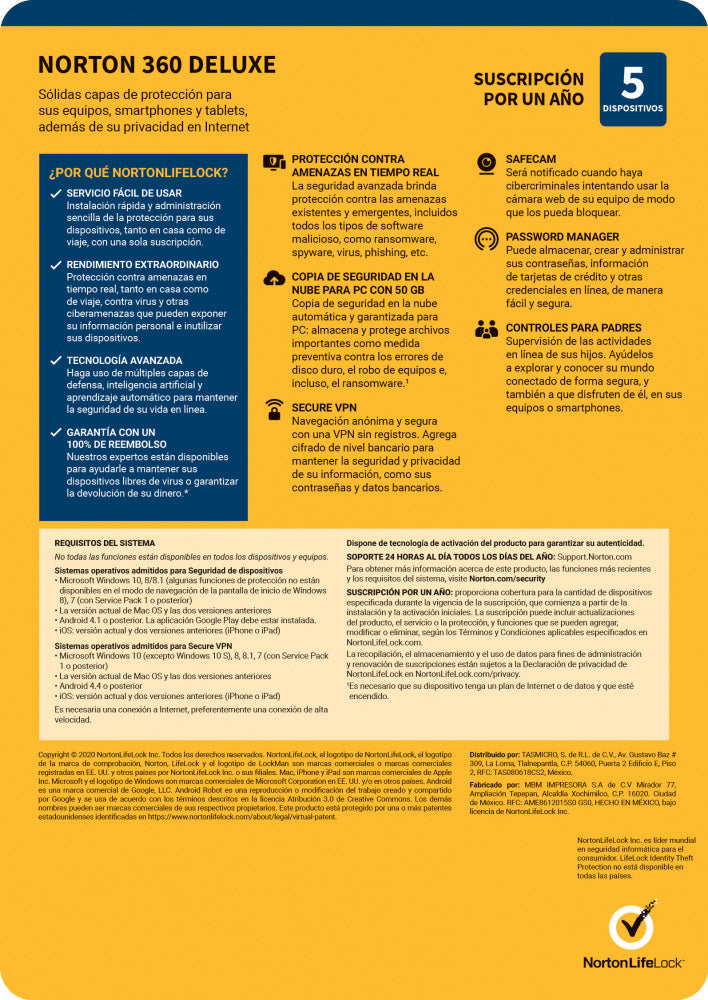 | • Seguridad del dispositivo: protección en tiempo real para hasta 10 dispositivos (PC, Mac o dispositivos móviles), contra ransomware, virus, spyware, software malicioso y otras amenazas en línea. |