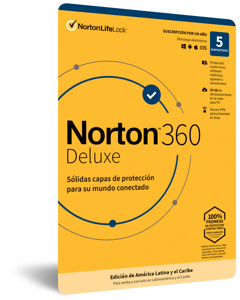 Norton 360 brinda potentes capas de protección para sus dispositivos conectados y su privacidad en Internet. Sus PC, Mac, tablets y smartphones están protegidos contra virus, ransomware, malware y otras amenazas mientras realiza operaciones bancarias, compras y publicaciones en línea. Con el cifrado de nivel bancario de Secure VPN la información personal que transmite por sus dispositivos está protegida tanto en casa como de viaje. E incluso si usa cualquier Wi-Fi, ayuda a impedir que los cibercriminales accedan a su información personal. |