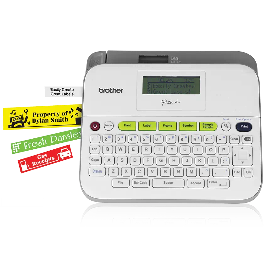 El modelo PT-D400 es un rotulador fácil de utilizar que permite crear etiquetas personalizadas de aspecto profesional rápidamente. Cuenta con 14 fuentes, 10 estilos de fuente, más de 600 símbolos y códigos de barras, que pueden satisfacer prácticamente todas las necesidades de etiquetado en su hogar y en la oficina. Esta rotuladora permite escribir, dar formato con las teclas de un toque e imprimir. Puede guardar hasta 50 etiquetas en la memoria de gran capacidad para ahorrar tiempo. El modelo PT-D400 funciona con cintas de TZe de hasta 18mm. El cómodo diseño de cinta de carga superior hace que los tamaños y colores del casete de la cinta se puedan cambiar fácilmente. Las cintas TZe estándares son duraderas y laminadas; por lo que resisten el agua, el calor y la decoloración.