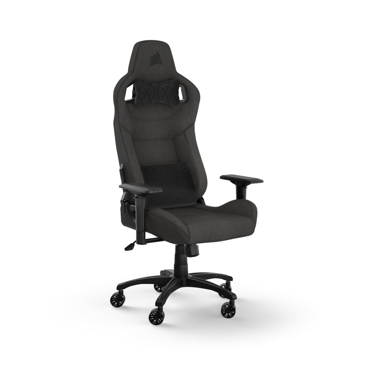 La silla para juegos CORSAIR T3 RUSH combina un diseño inspirado en las carreras y una comodidad contorneada con un exterior de tela suave y transpirable. almohada cervical acolchada exterior y soporte lumbar de espuma viscoelástica.