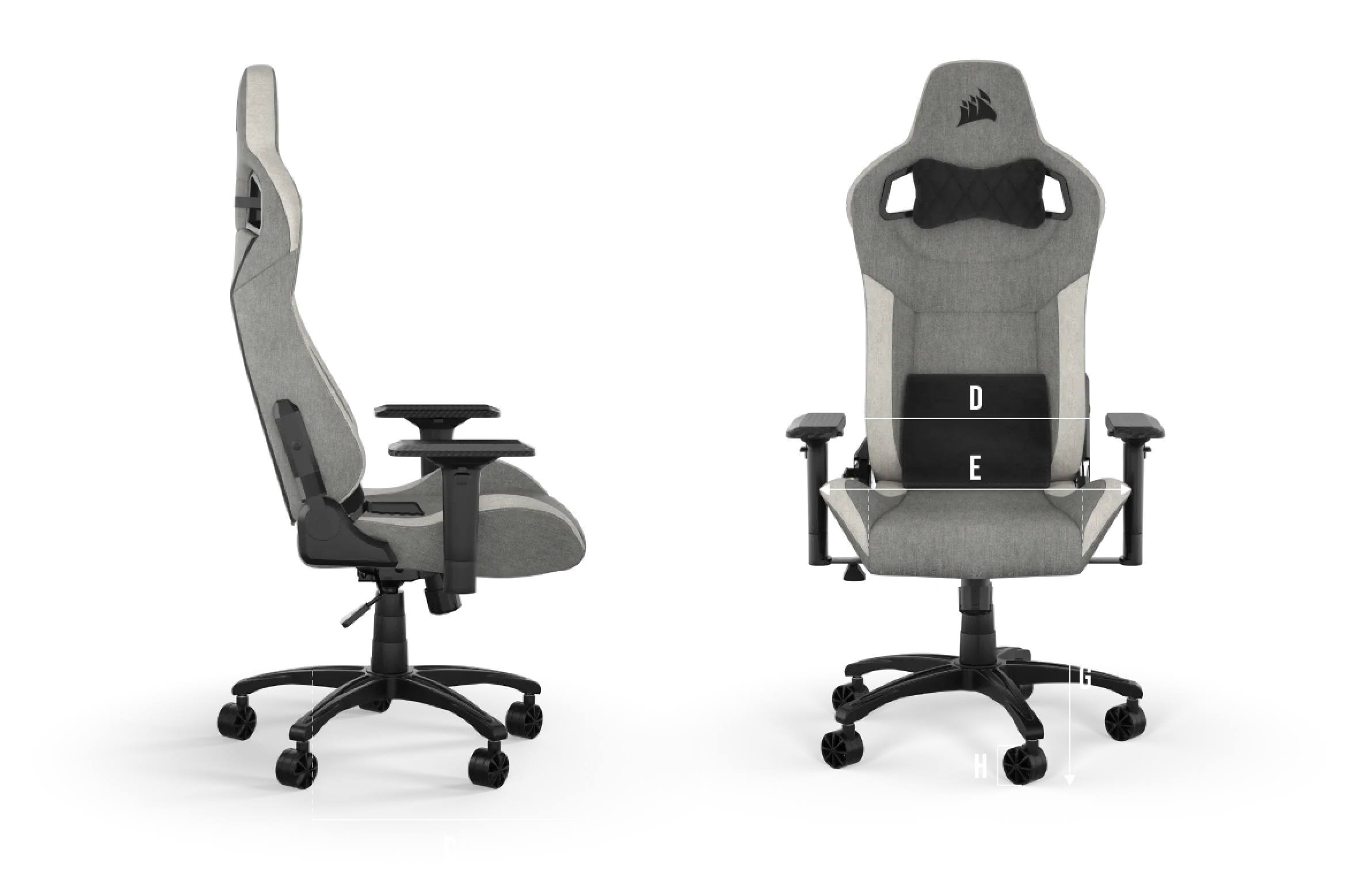 La silla para juegos CORSAIR T3 RUSH combina un diseño inspirado en las carreras y una comodidad contorneada con un exterior de tela suave y transpirable. almohada cervical acolchada exterior y soporte lumbar de espuma viscoelástica.