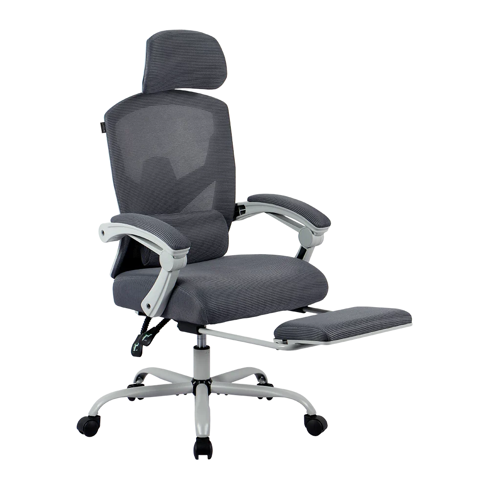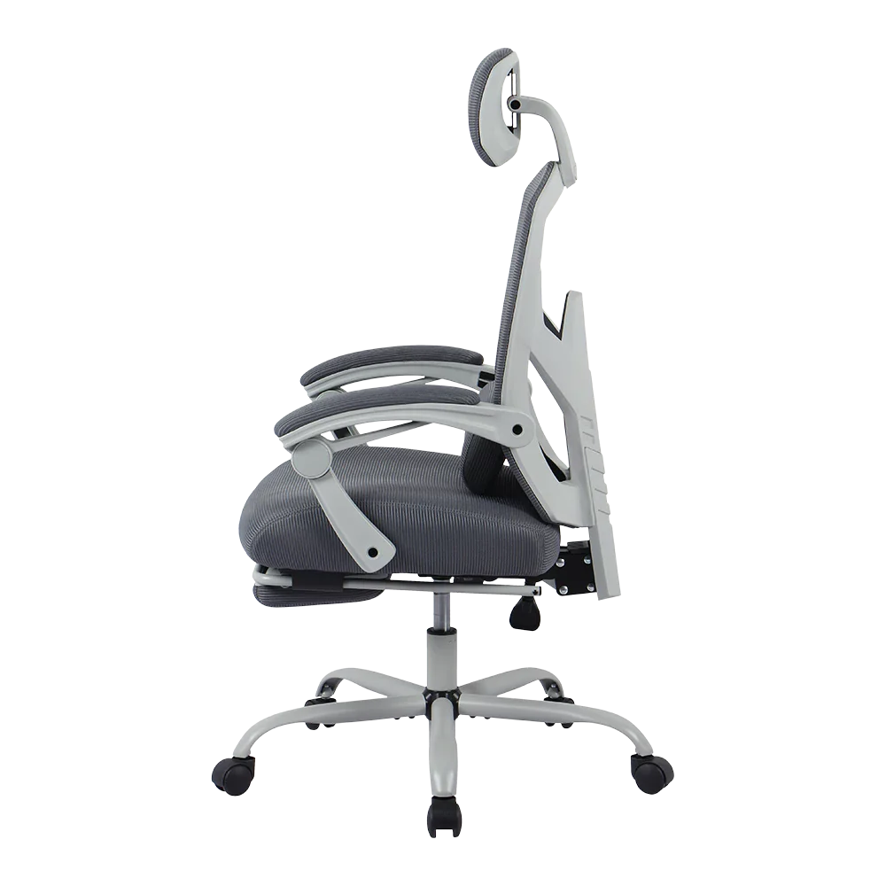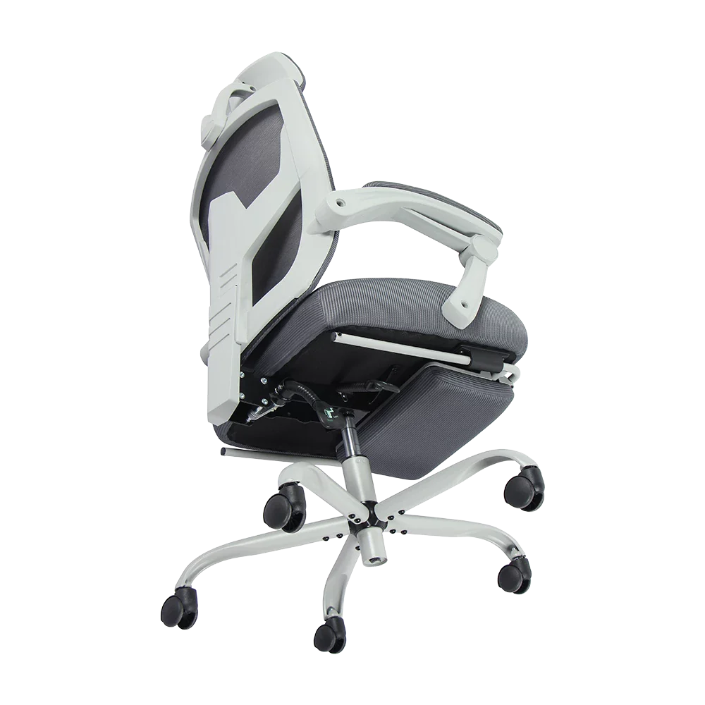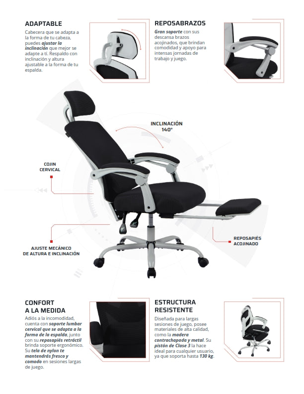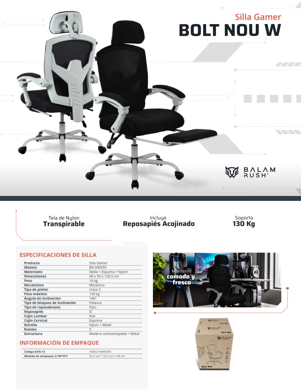 Silla Gamer Bolt Nou W | Azender Gris | Malla Transpirable + Espuma Confort | Soporte 130 kg | Inclinación 140° | Reposabrazos Fijos + Reposapiés + Cojín Lumbar | Pistón Clase 3