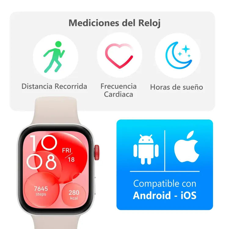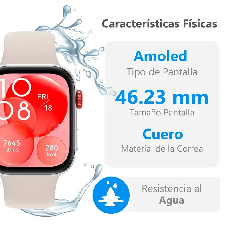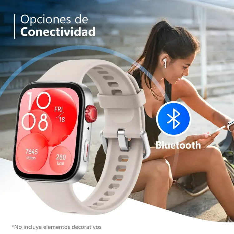 Huawei WATCH Fit 3. Diagonal de la pantalla: 4.62 cm (1.82"), Tecnología de visualización: AMOLED, Resolución de la pantalla: 408 x 480 Pixeles, Pantalla táctil. Wifi. GPS (satélite). Capacidad de batería: 400 mAh. Peso: 26 g. Material de la banda: Fluoroelastómero, Color de banda: Blanco, Tamaño de banda: Talla única