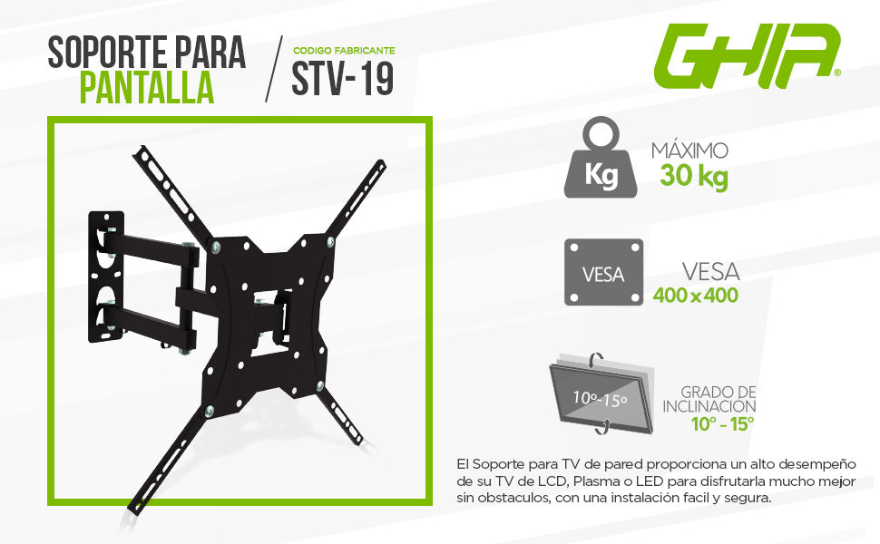 Soporte Ghia Articulado Para Pantalla Led, Lcd, 23-55 Pulgadas, 30kg Max, Inclina La Pantalla Hacia Arriba 5 Y 10 Hacia Abajo, Dos Niveles De Ajuste De Pantalla De 90 Hacia La Derecha O Izquierda