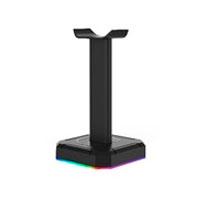 SOPORTE PARA HEADSET EN TRES PIEZAS. LUZ LED RGB CON ILUMINACION ALEATORIA. INCLUYE CABLE CARGADOR TIPO USB-A CONECTADO A LA BASE