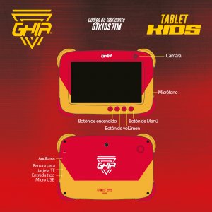 UNIDAD DE PROCESAMIENTO QUAD CORES HASTA 1.2 GHZ// DISPLAY 7 TN // MULTITOUCH DE 5 PUNTOS // RESOLUCION 1024 X 600 // MEMORIA RAM DE 1GB// MEMORIA ROM DE 16 GB // EXPANDIBLE HASTA 32 GB // CAMARA FRONTAL 0.3 MEGAPIXELES// CAMARA TRASERA 2.0 MEGAPIXELES // 1 MICRO USB// 1 AUDIO JACK// G SENSOR // WIFI B/G/N // 1 CABLE USB // 1 CABLE OTG// AUDIFONOS INCLUIDOS // BATERIA DE 3.7V 2500MA // TERMINADO RUBBER ROJA CON ESQUINAS DE GOMA AMARILLAS// ANDROID VERSION 9.