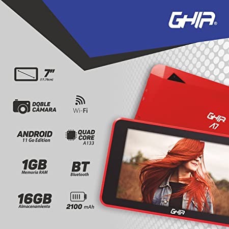 TABLET GHIA A7 WIFI/A133 QUADCORE/WIFI/BT/1GB/16GB/0.3MP2MP/2100MAH/ANDROID 11 GO EDITION/ROJA