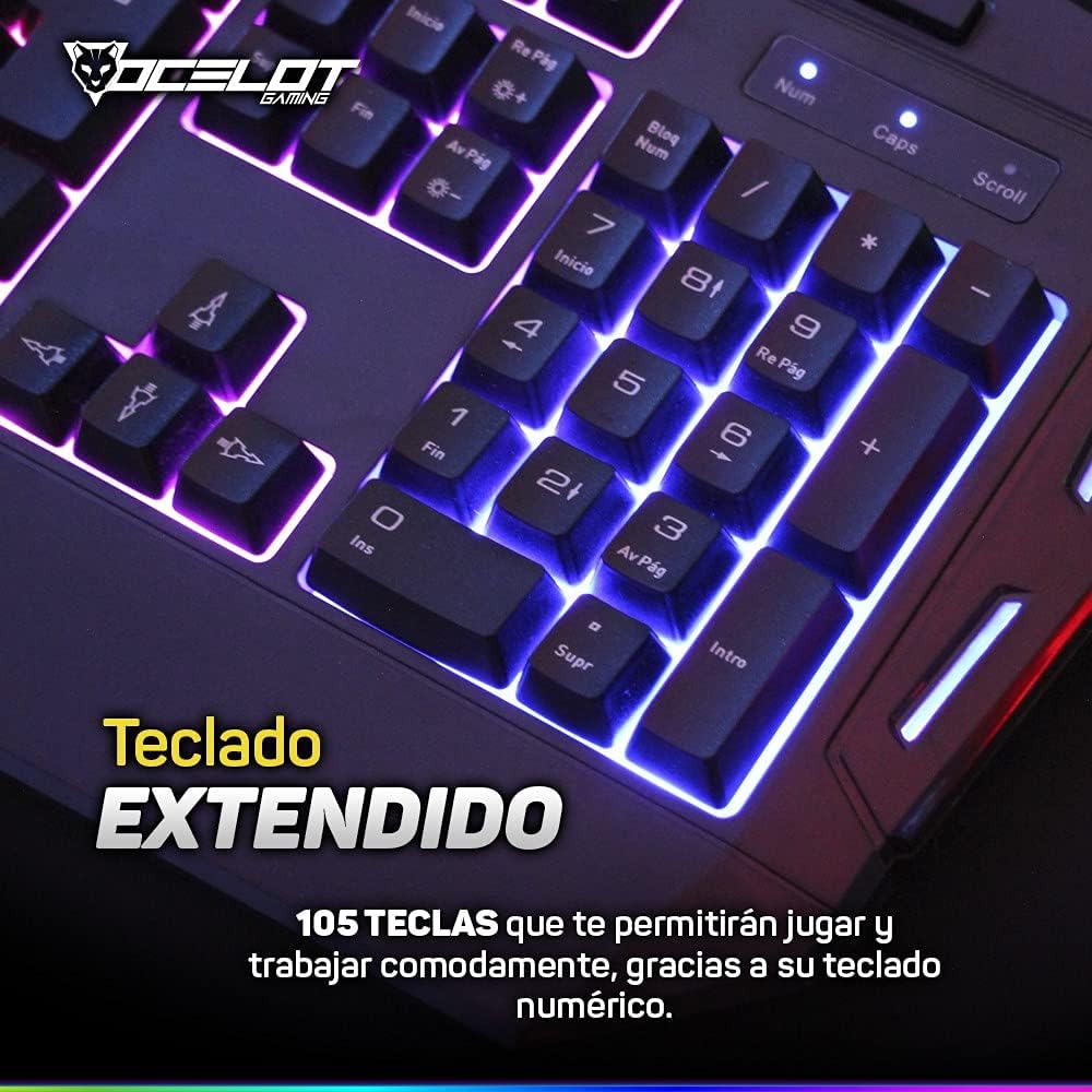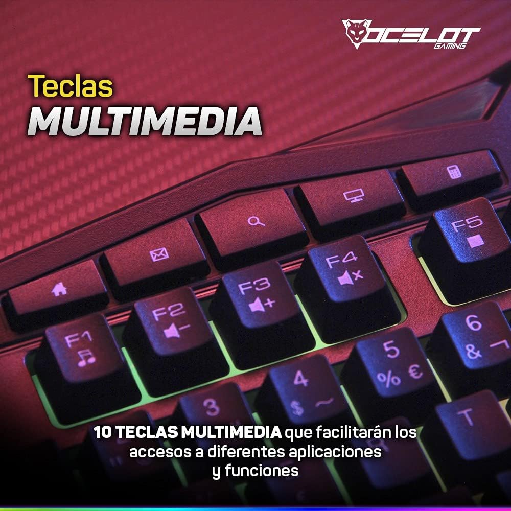 Teclado Membrana Extendido Ocelot, Alambrico, Plastico, Negro, Iluminacion Tipo Arcoiris, Teclas Multimedia, Gamer