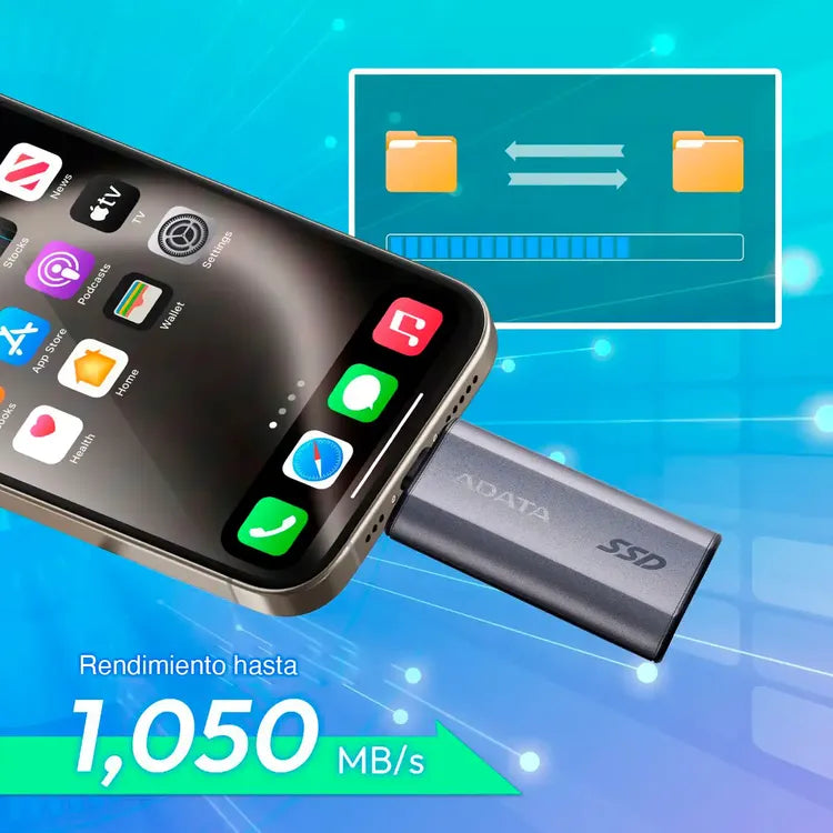La unidad de estado sólido Externo SC750 de ADATA tiene un tamaño compacto y no requiere de cables adicionales, es fácil de transportar, ligero y no ocupa mucho espacio. Desliza su conector Type-C para empezar a transferir archivos grandes al instante, este dispositivo permite grabación directa en iPhone 15 Pro y Pro Max, suple la necesidad de adquirir un smartphone de mayor capacidad, en definitiva, un almacén virtual para tus juegos portátiles, haz copias de seguridad y descarga tus juegos favoritos, con su puerto USB Tipo C permite conectar diferentes dispositivos. ¡Consigue el tuyo ahora!